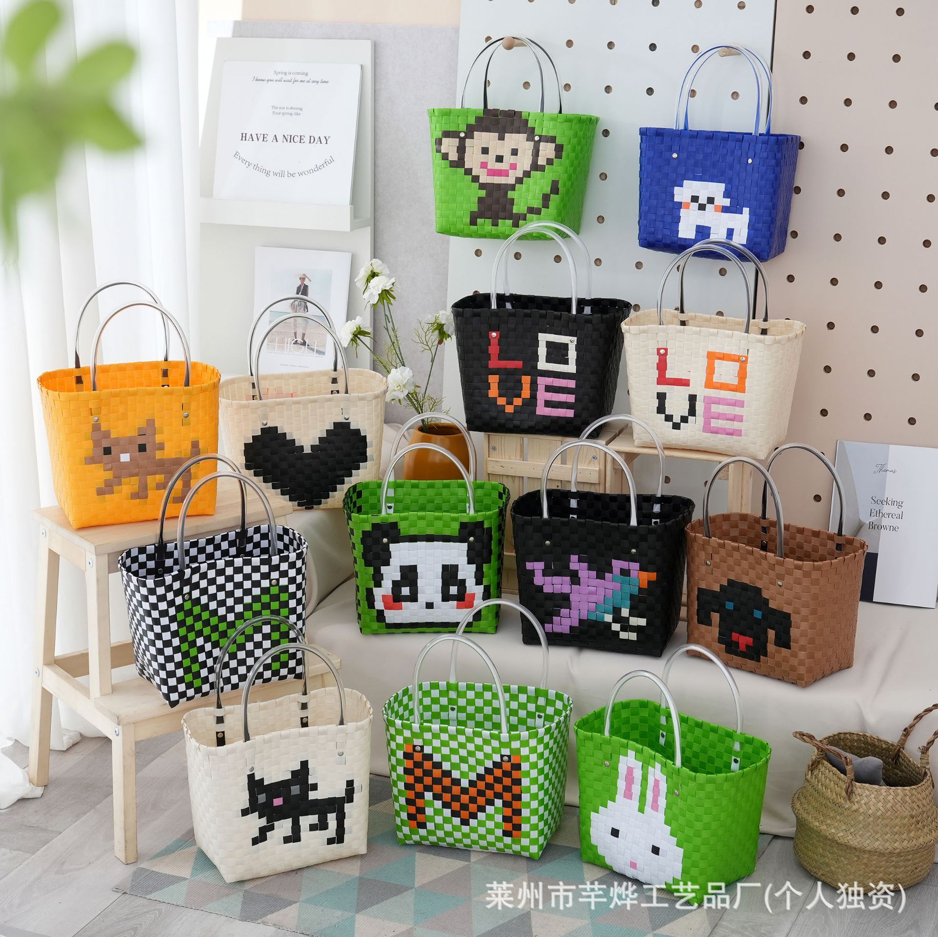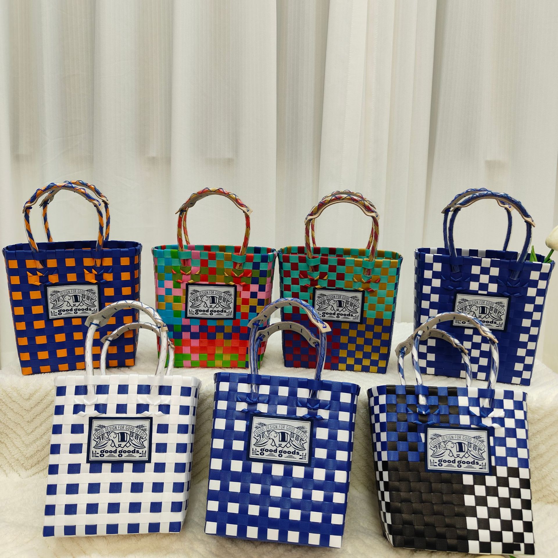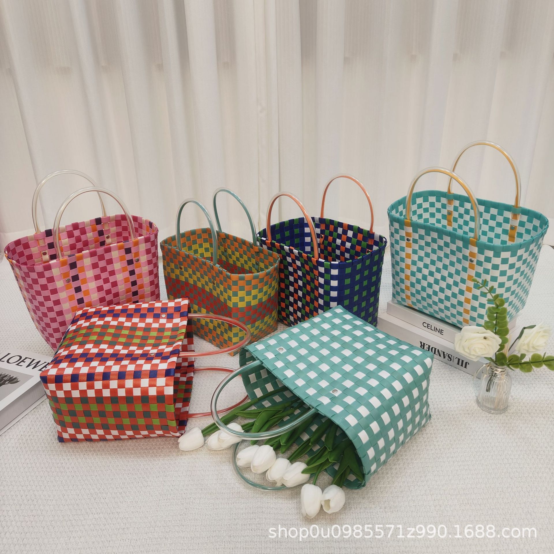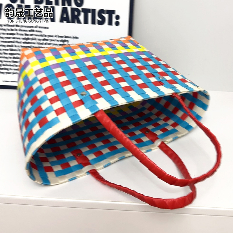 夏の小清新なつなぎ合わせは色のハンドバッグのカラーの棋格のプラスチックの編み物の包みのお土産のdiyの手作りのかごにぶつかります。