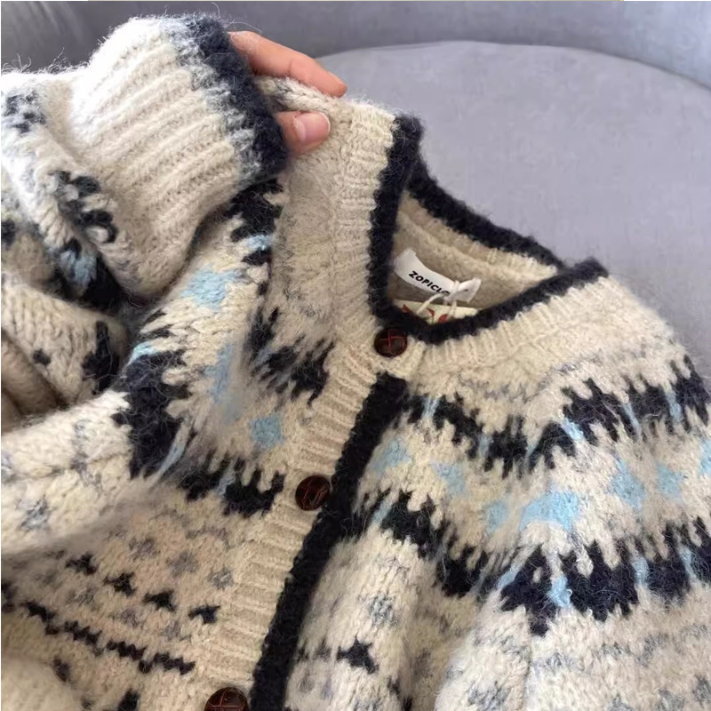 复古提花圆领针织开衫女秋冬加厚单排扣宽松费尔岛毛衣外套洋气上
