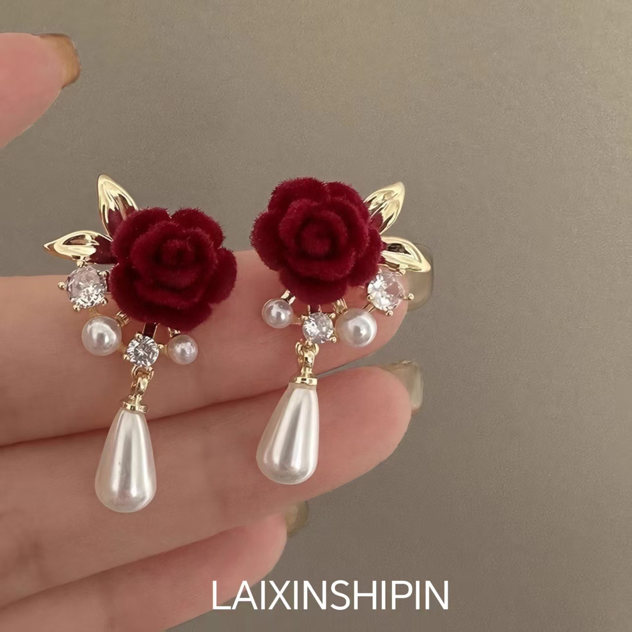 小众红玫瑰毛绒耳钉女耳夹秋冬简约耳饰设计感红玫瑰珍珠耳钉红色
