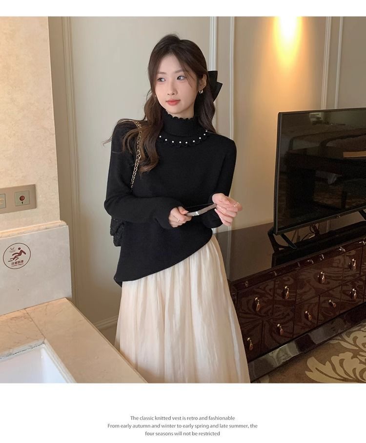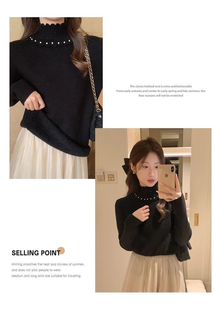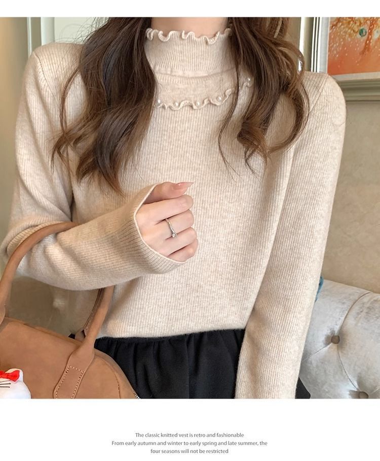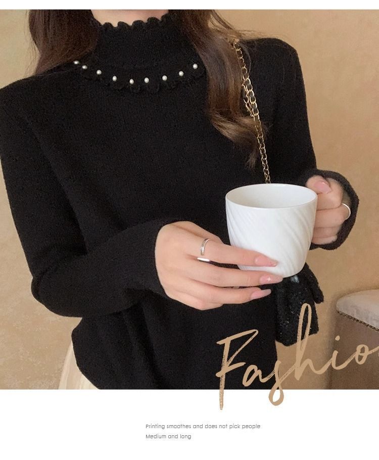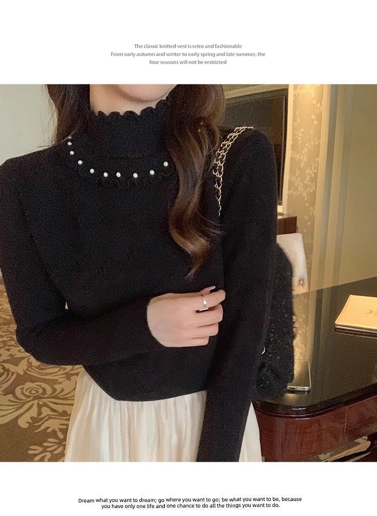 小香風半高襟インナーシャツ女性冬春と秋の新作真珠セーター2023レースニット上着