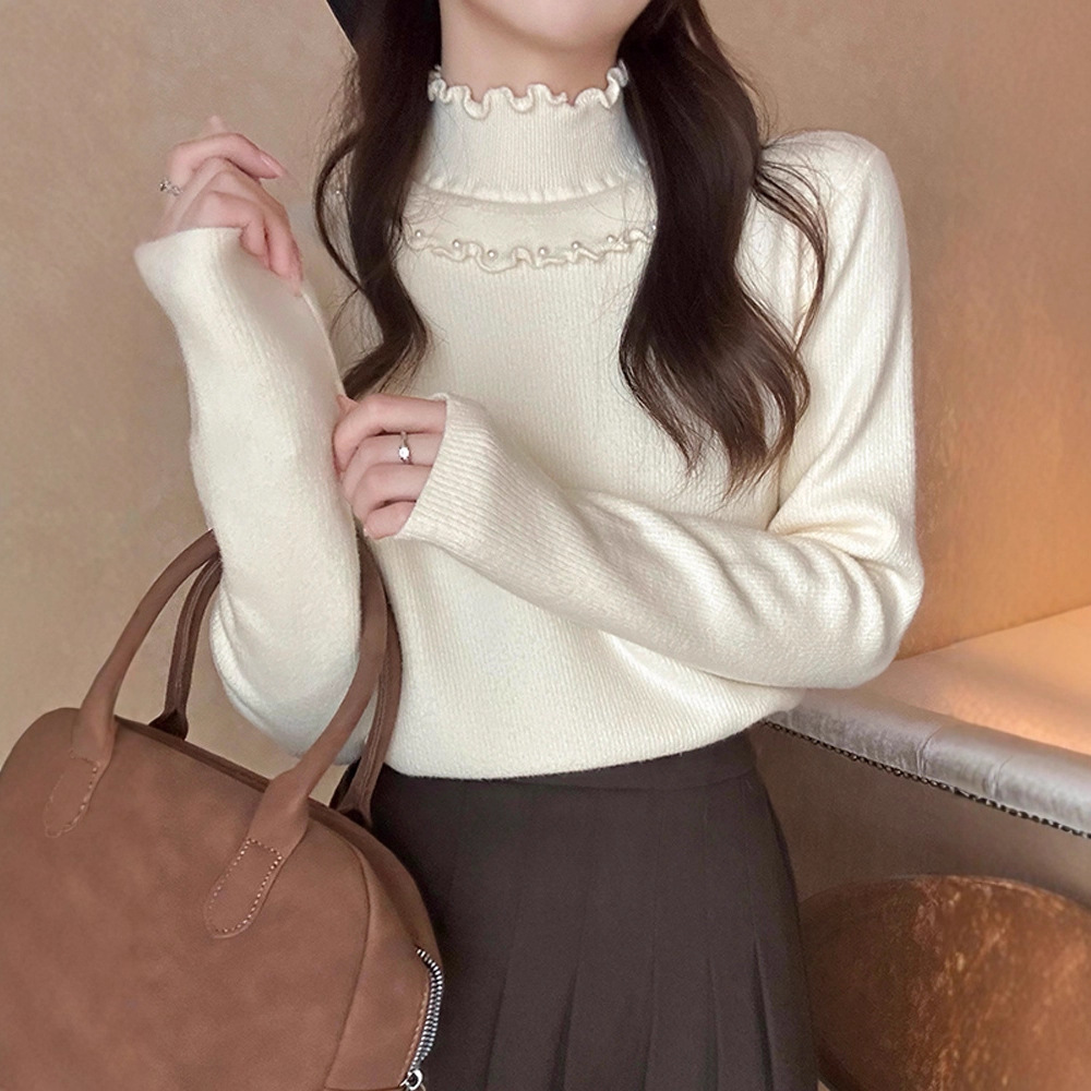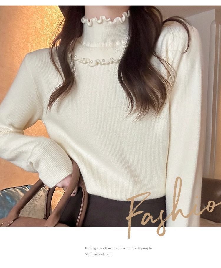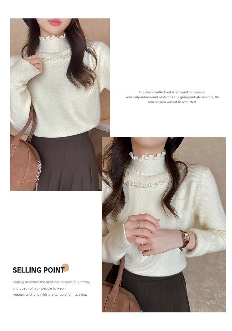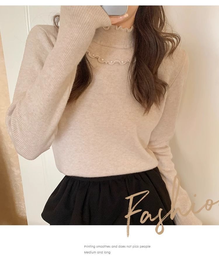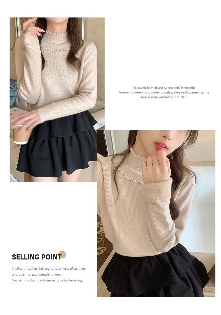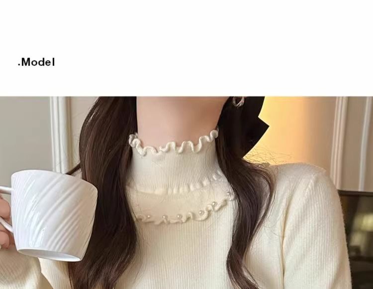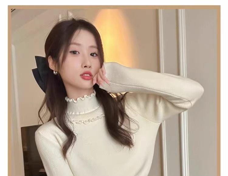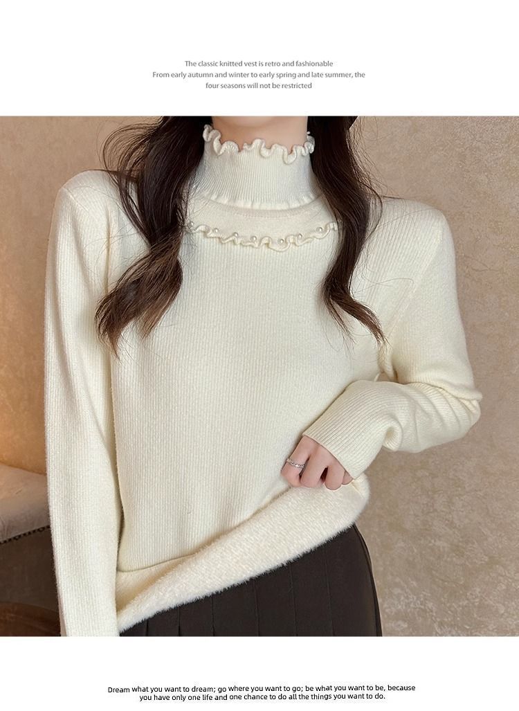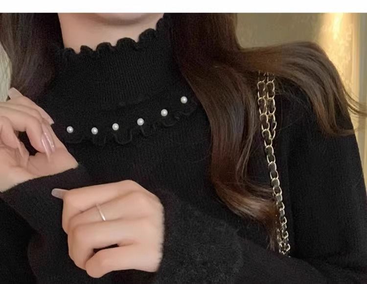 一体绒面料 加绒半高领毛衣钉珠设计感上衣秋冬木耳边打底针织衫