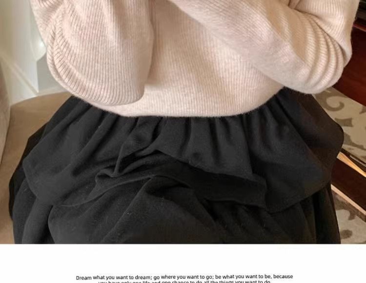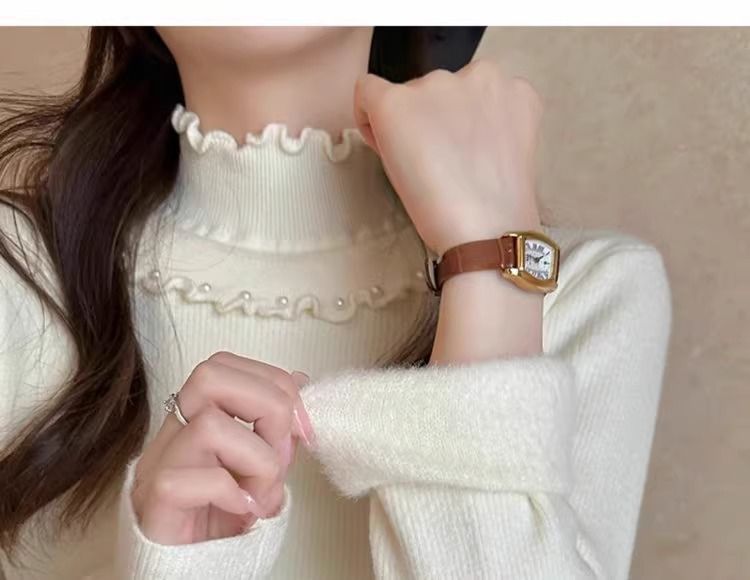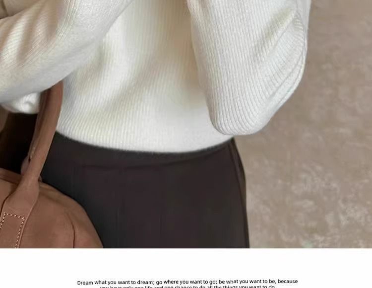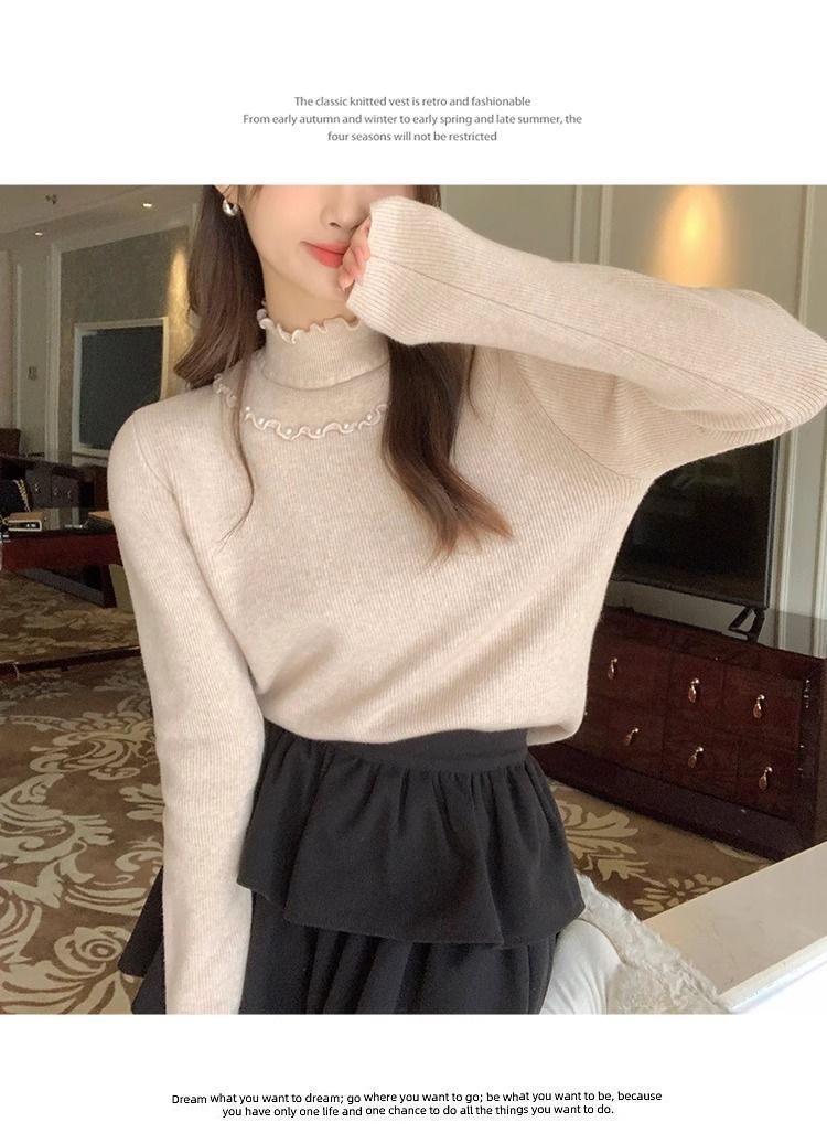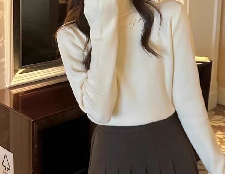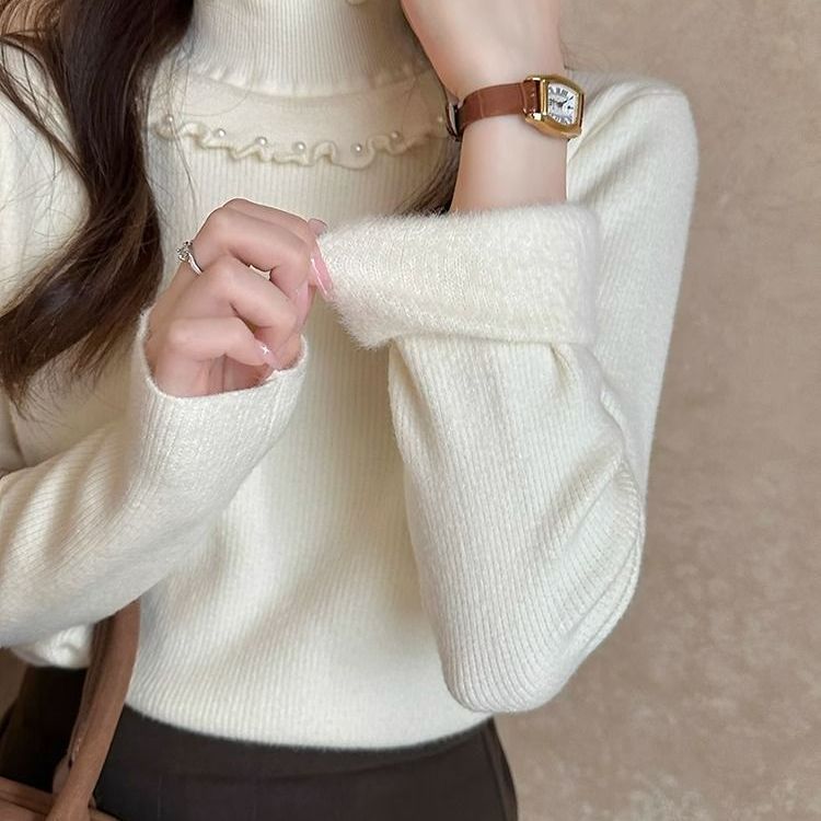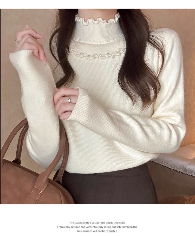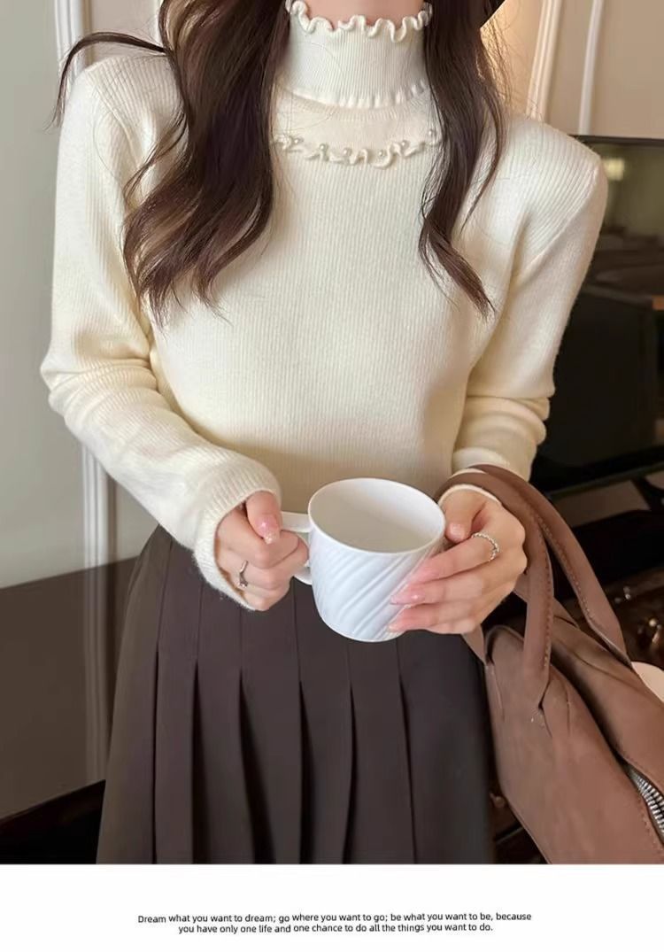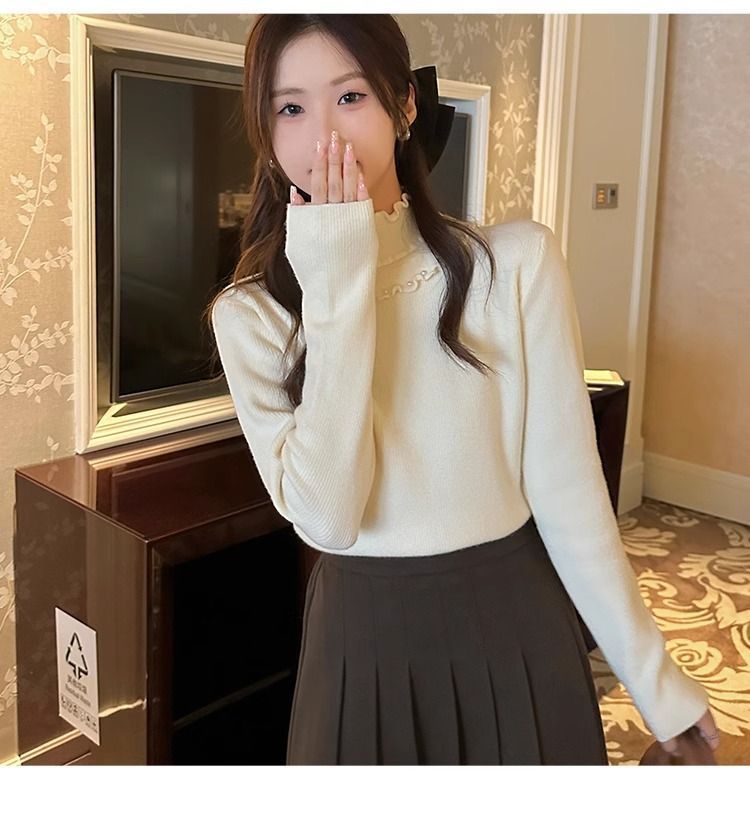 一体绒面料 加绒半高领毛衣钉珠设计感上衣秋冬木耳边打底针织衫