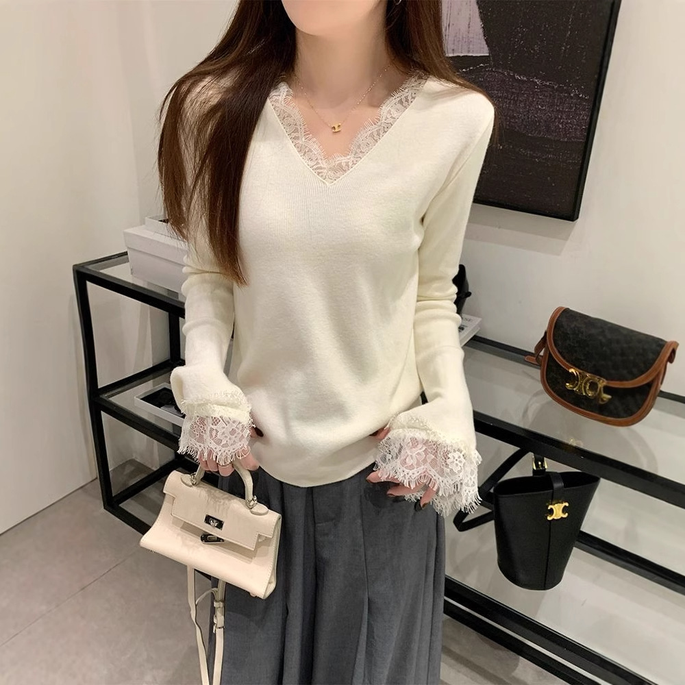 フランスvネックの気質レースは純粋なニットの女性春秋の新型の長袖の高級な底を結んでセーターを掛けます。