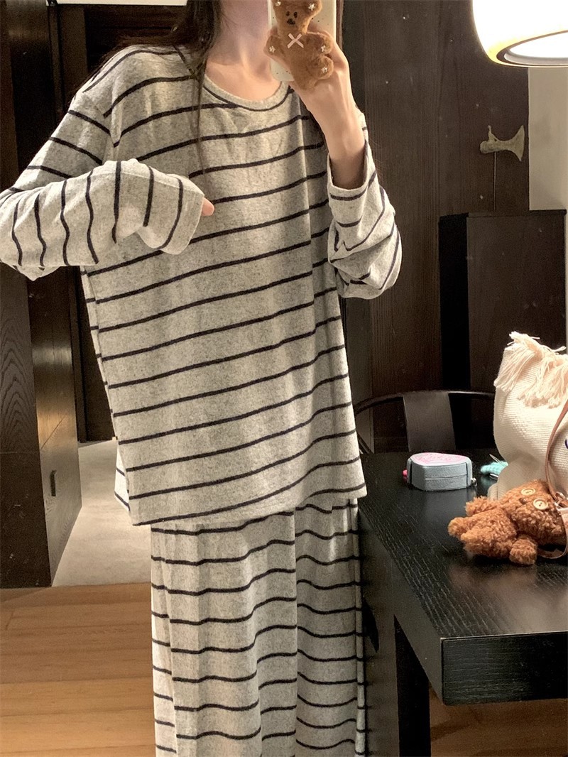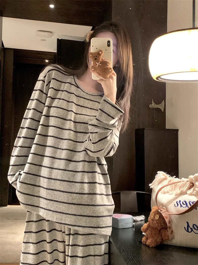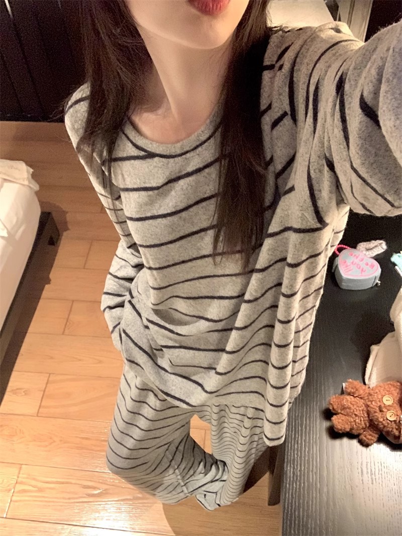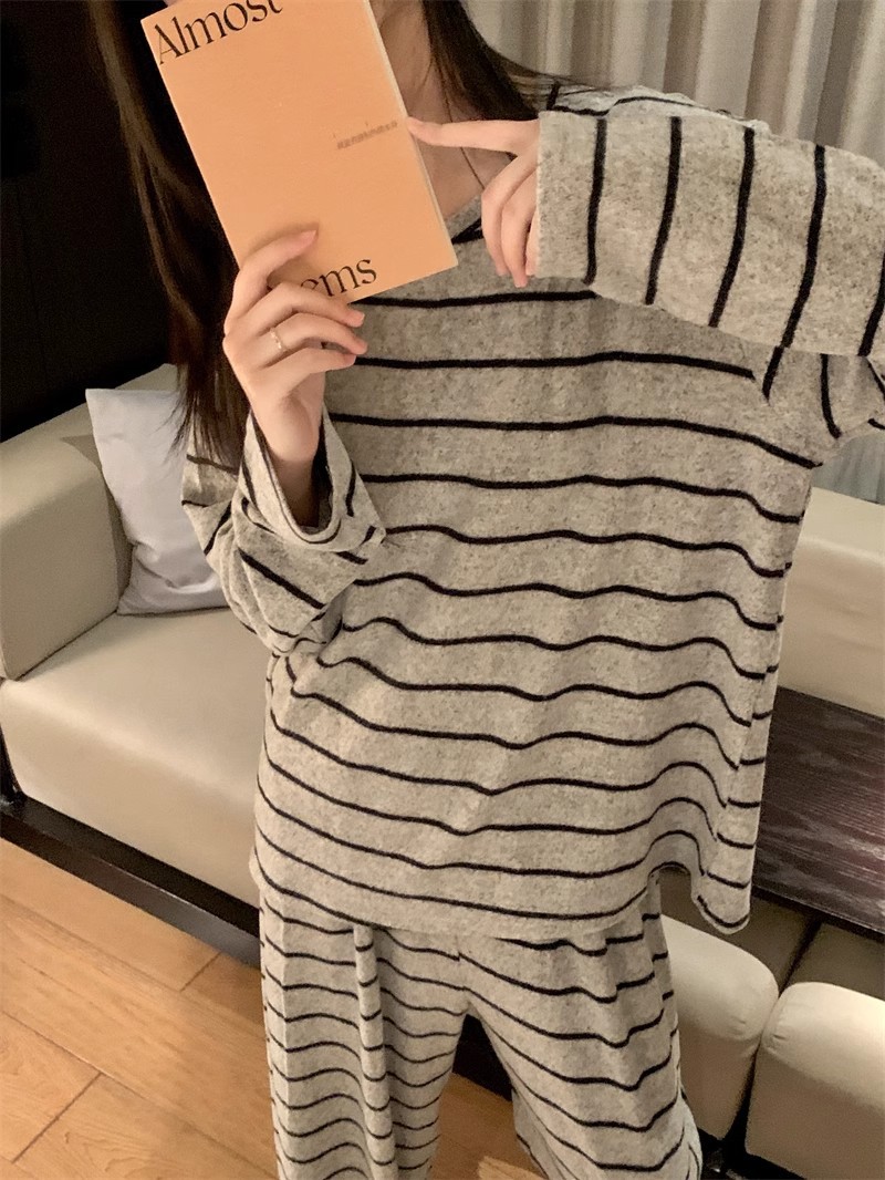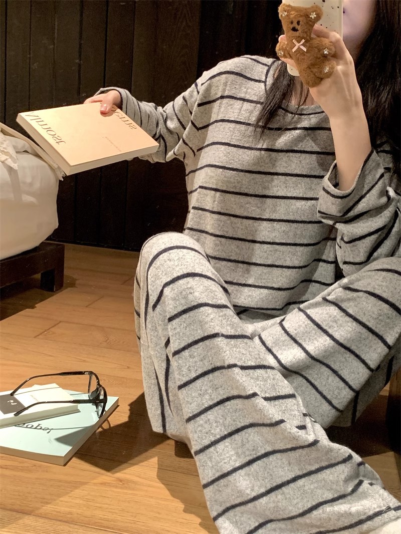 2025年秋冬网红风季新款德绒灰色条纹简约休闲睡衣韩版家居服