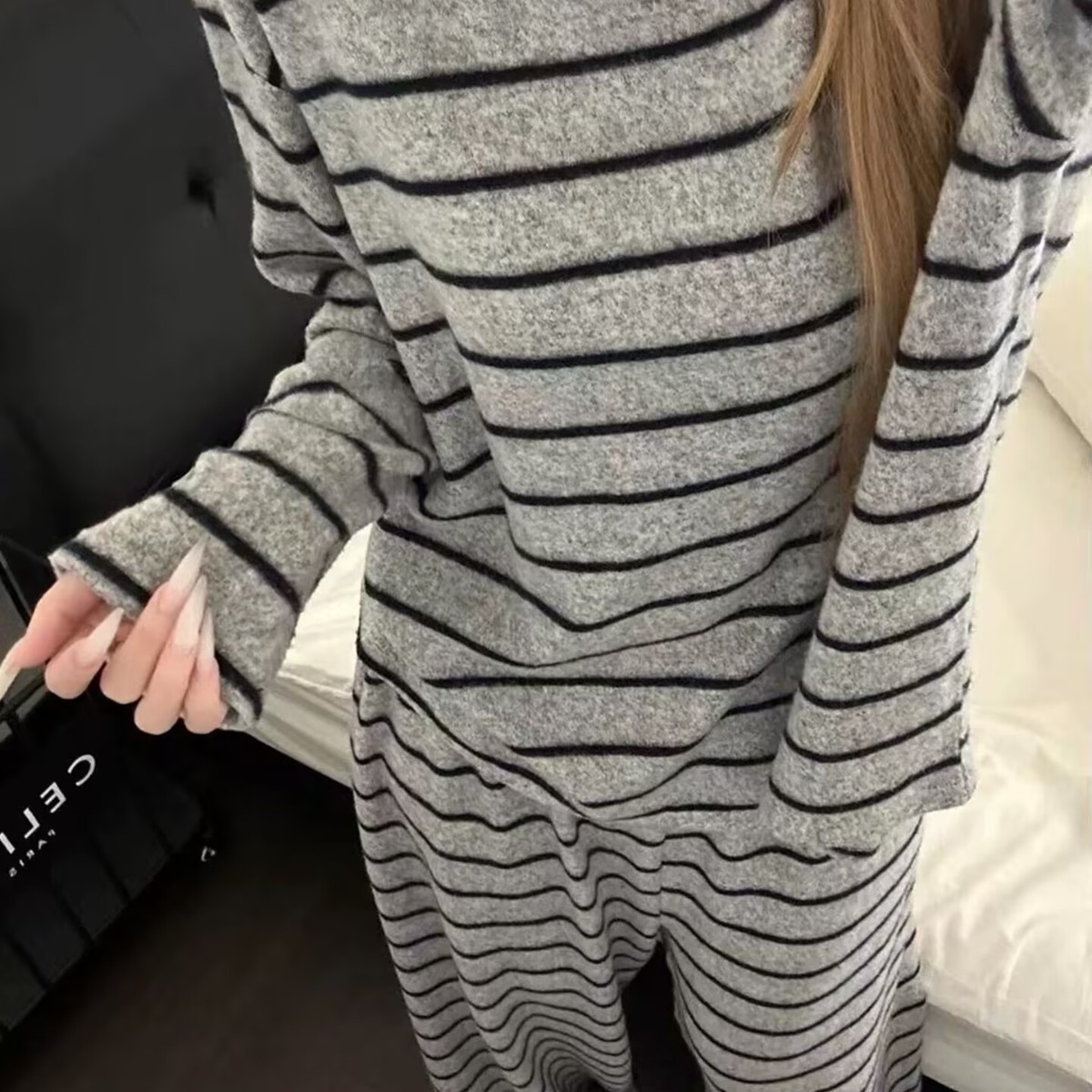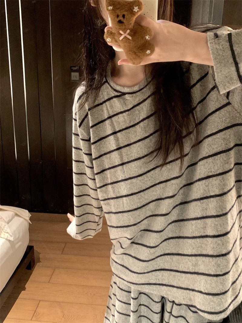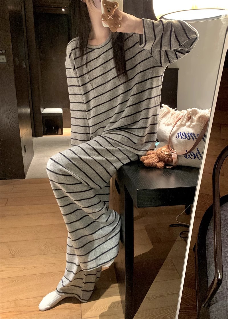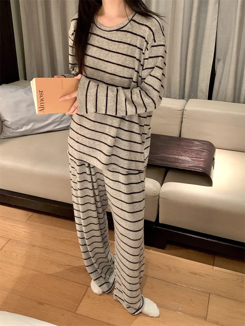2025年秋冬网红风季新款德绒灰色条纹简约休闲睡衣韩版家居服