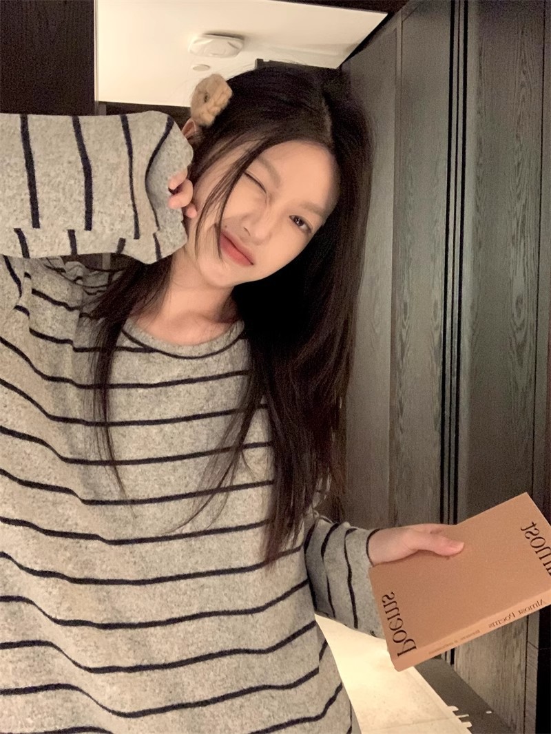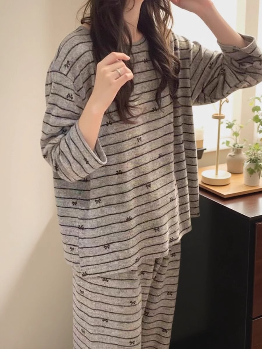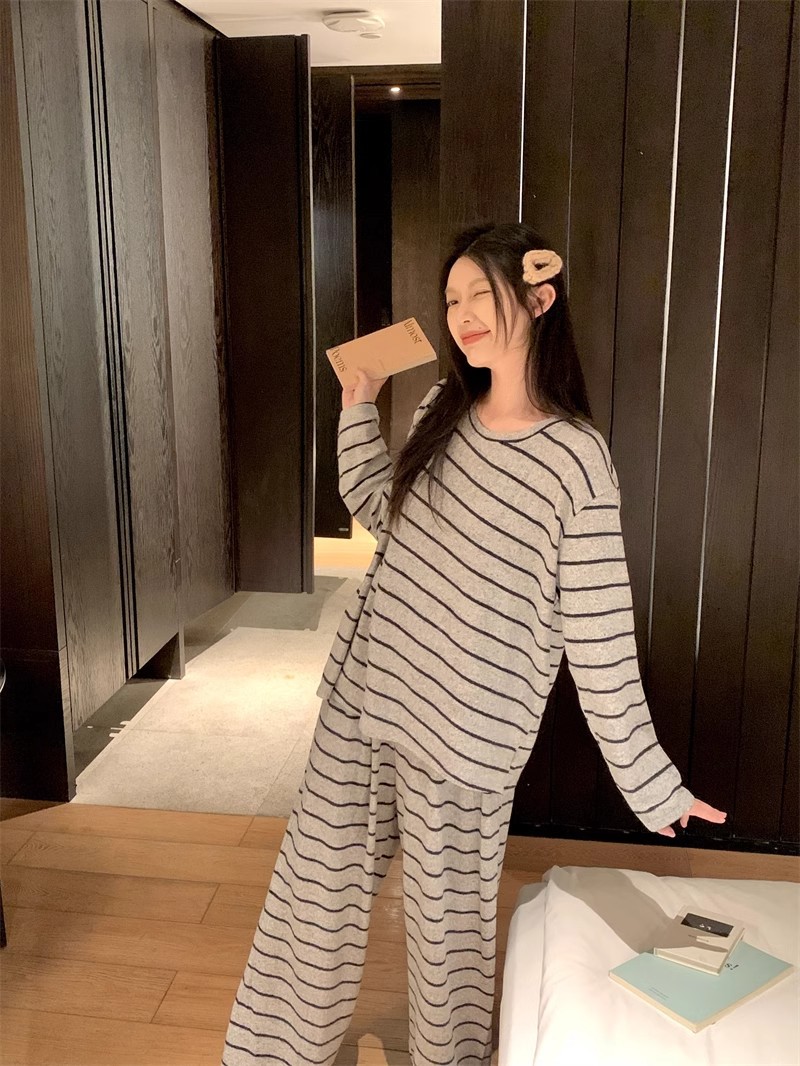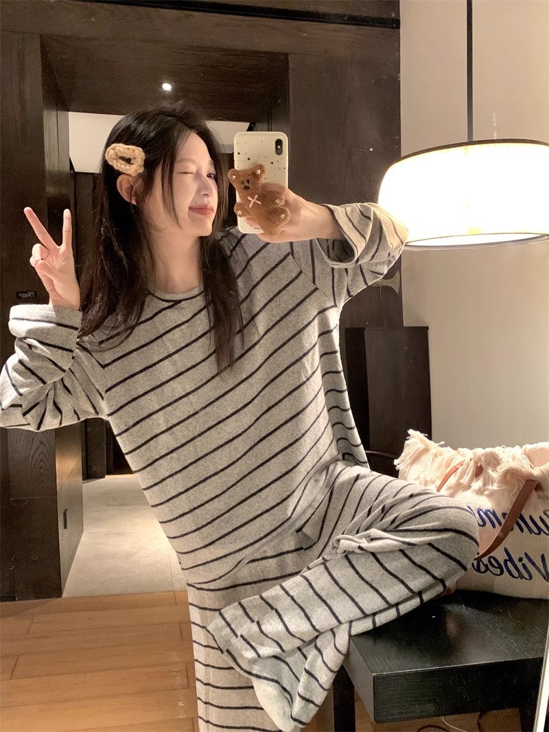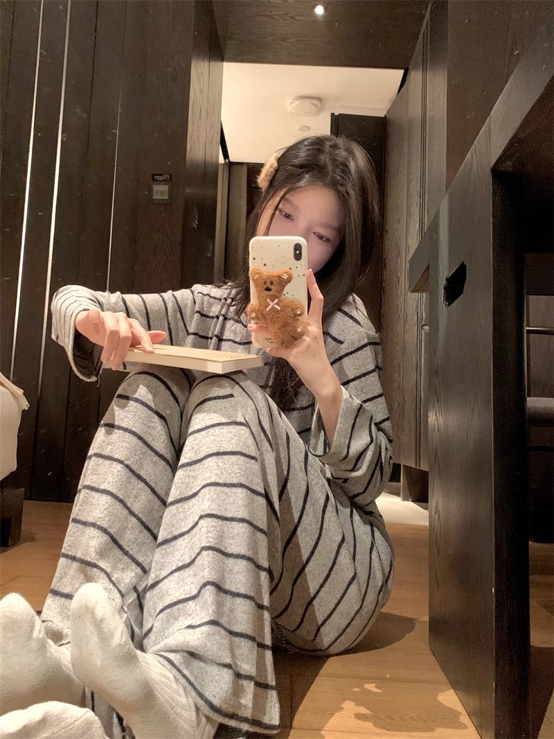2025年秋冬新作ネット紅風韓国版ストライプの灰色のストライプのパジャマ女性の家庭服は外着ができます。