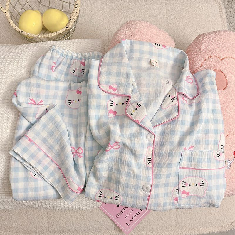 クラウドコットン漫画キティパジャマ女性の春と秋の長袖インスタイル日本のかわいいチェック柄夏のホーム服