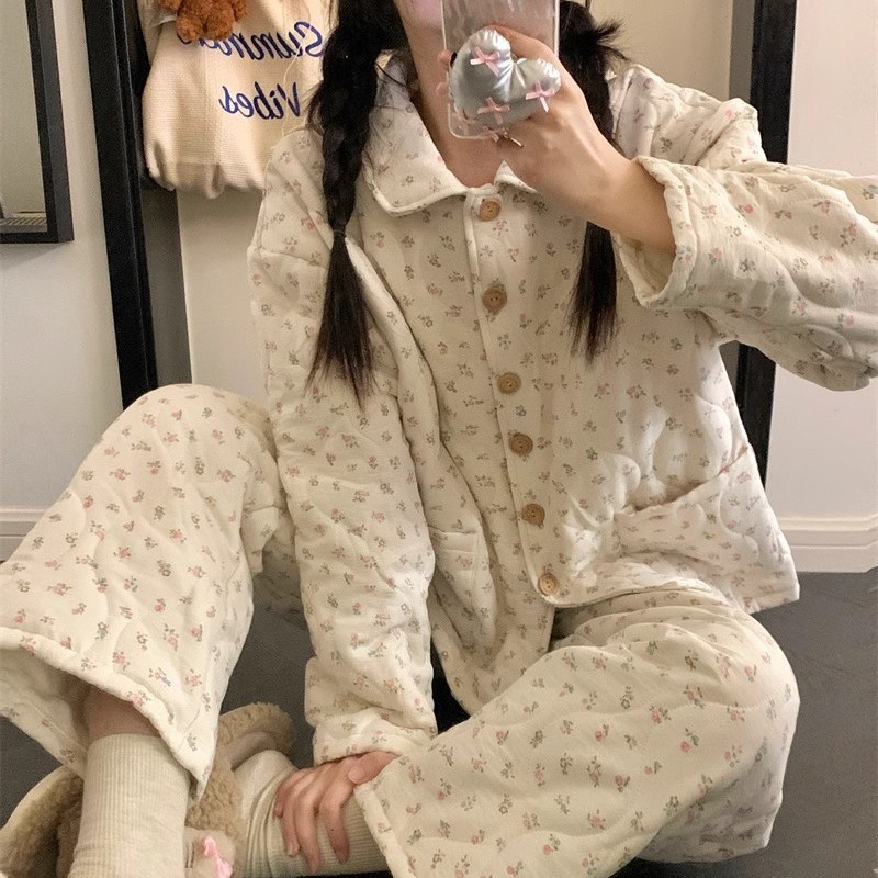 2025年冬の新型梅の花の中間層の甘い小さい花のネットの赤い風の空気の綿のパジャマの女性の家の服のスーツ