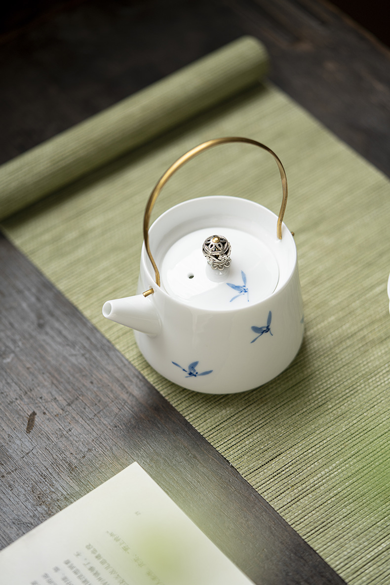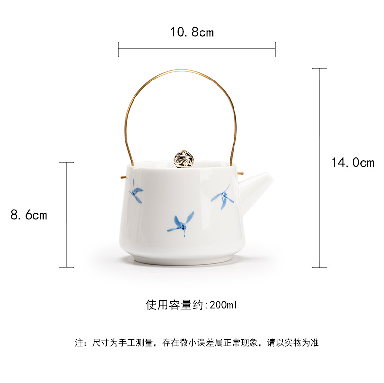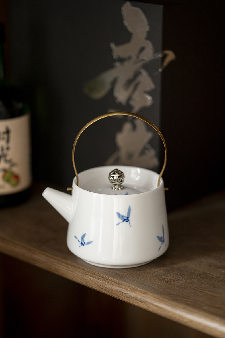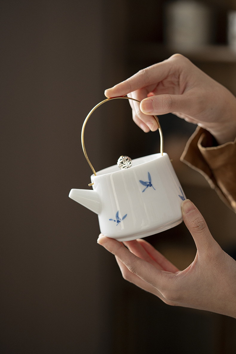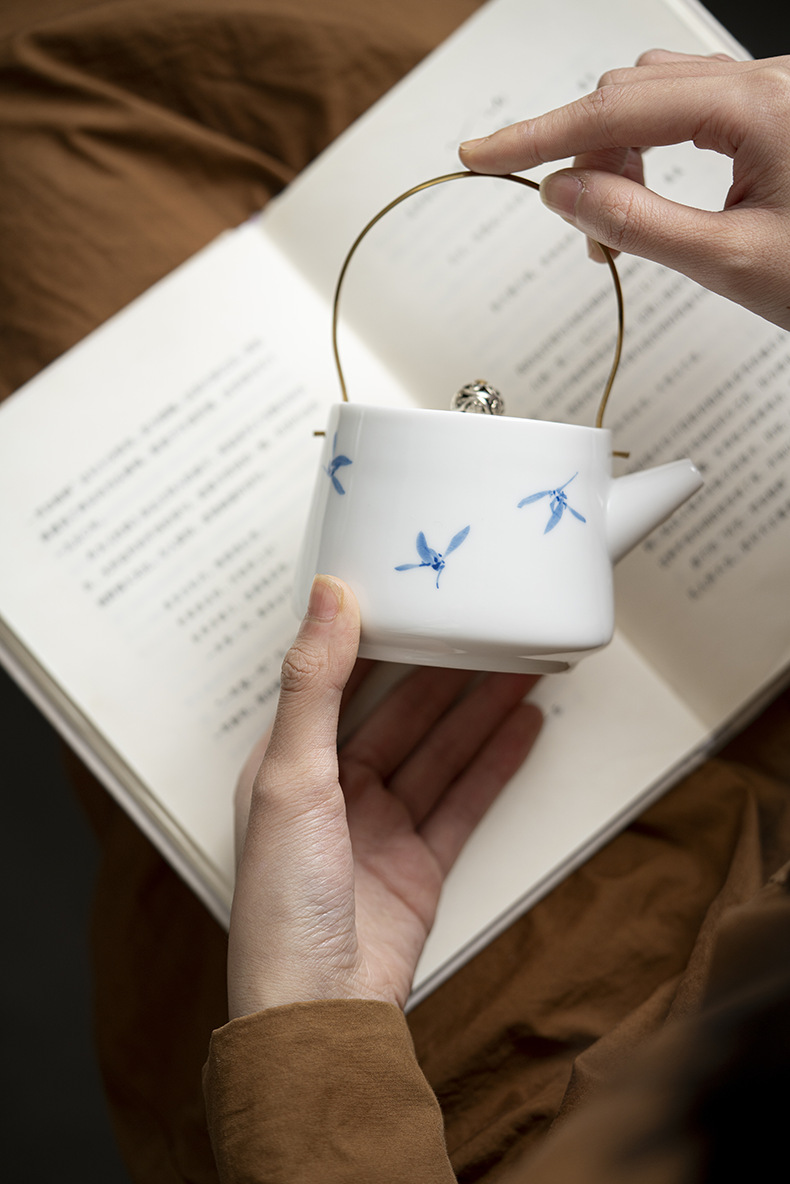 白磁手描き蘭美容ショルダーポット青と白のセラミックティーシングルポット手持ちポットレトロスタイルティーセット