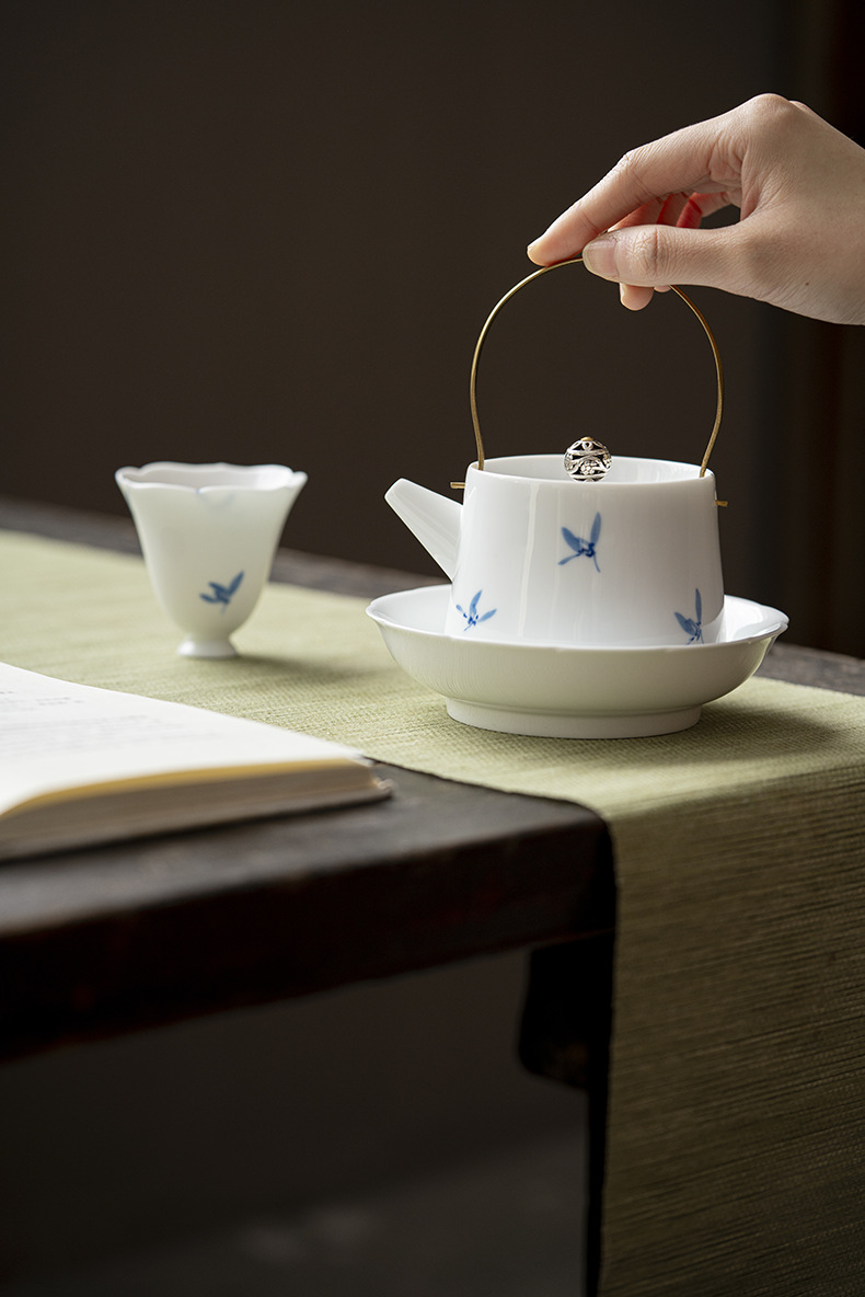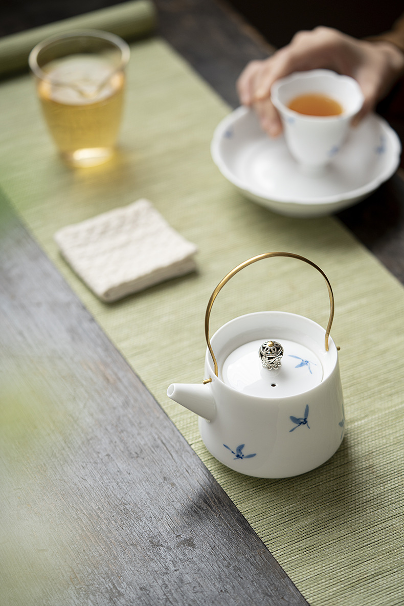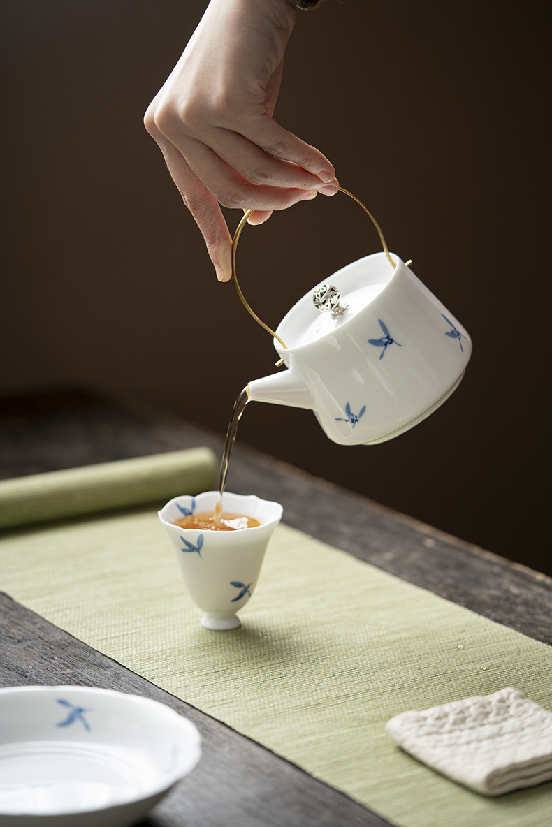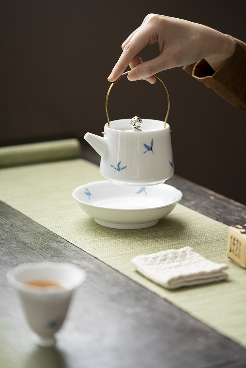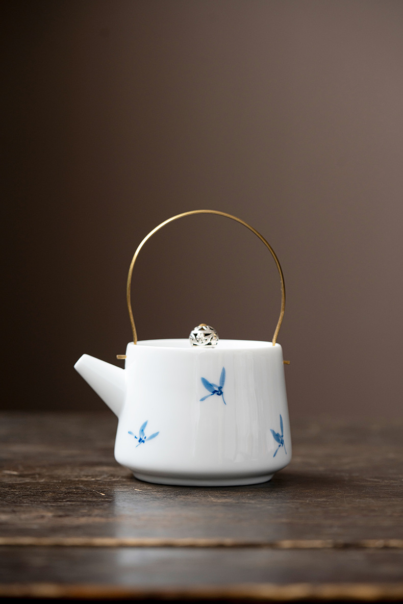 白磁手描き蘭美容ショルダーポット青と白のセラミックティーシングルポット手持ちポットレトロスタイルティーセット