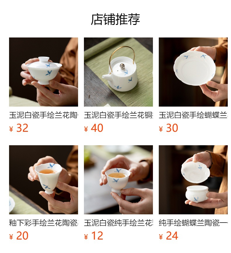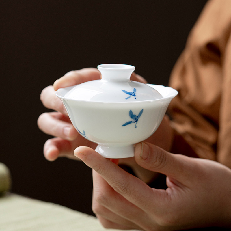 玉泥の白い磁器の手描きの蘭の陶磁器の花の口の2才の蓋の碗の釉薬の下で色の家庭の工夫の茶器の小さいサイズはお茶の碗を入れます。
