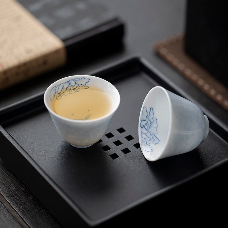 純粋な手描きの蝶と花の内側に下絵付けされたセラミックティーカップ、小さなティーカップ、家庭用の高級な小さな新鮮なカンフー茶セット