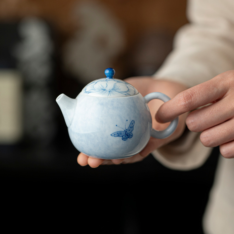 下絵手描きの青い蝶と花のセラミックティーポット、ボールホールフィルター付きカンフーティーセット家庭用小容量ティーポット