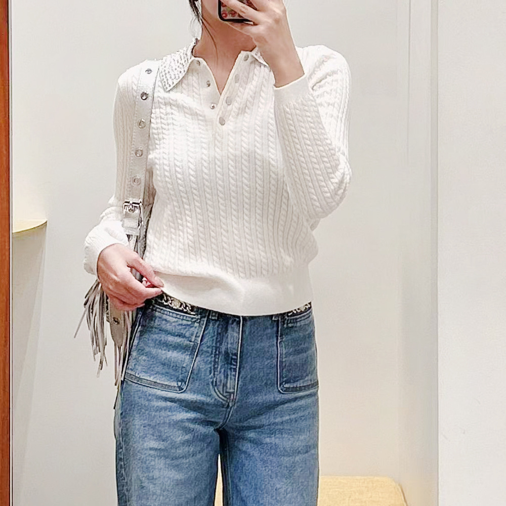 法式优雅25早春新款绣珠可拆卸娃娃领绞花套头短袖针织衫百搭上衣