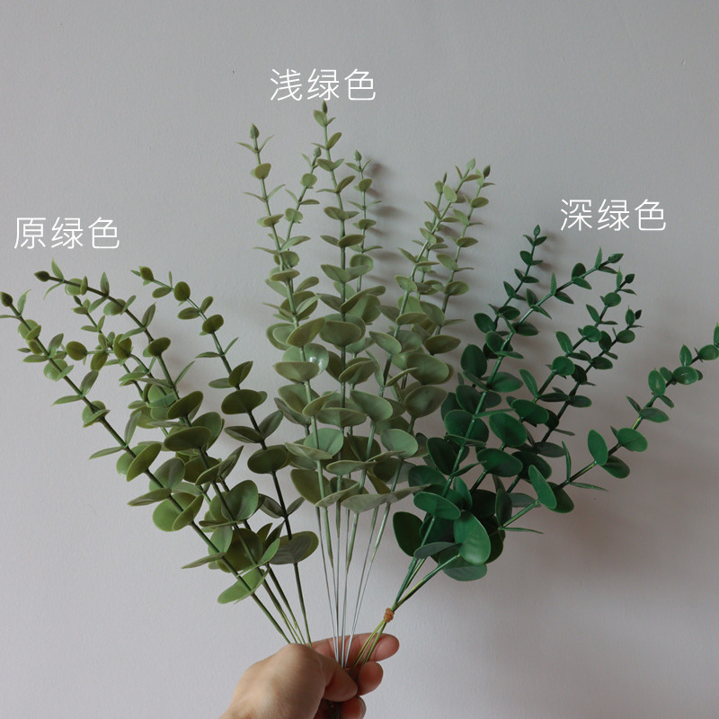 単一のユーカリのプラスチックの葉は緑を植えて霜の白いユーカリの人工の生け花を掛けます。