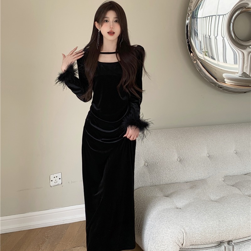 早秋黑色法式金丝绒连衣裙新款女装春秋季高级感收腰内搭长裙