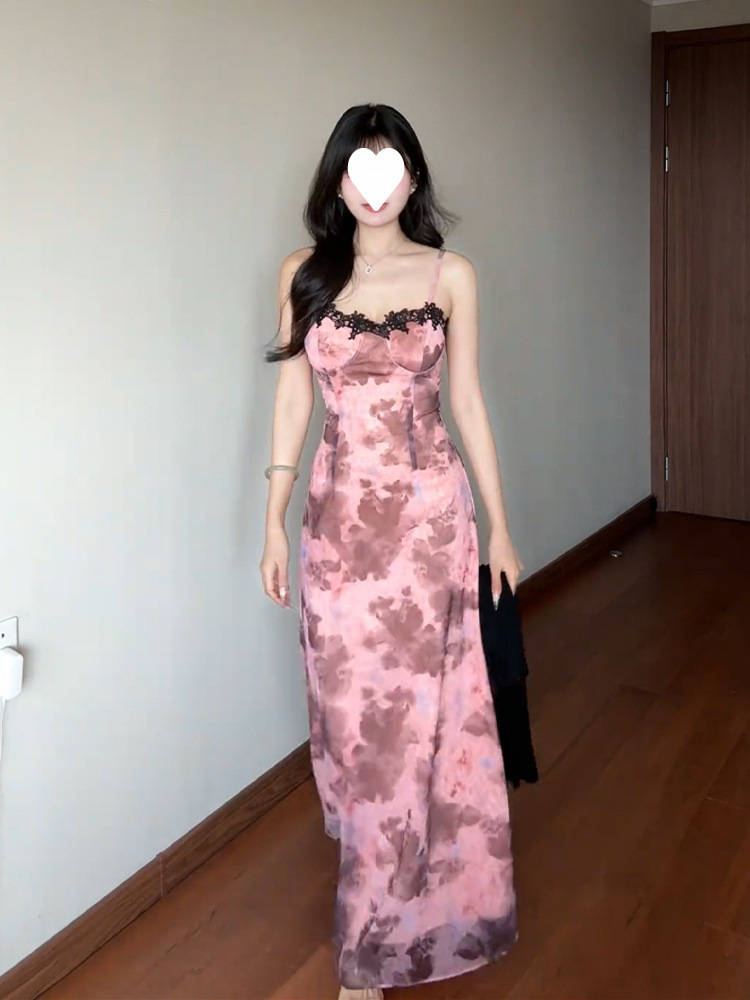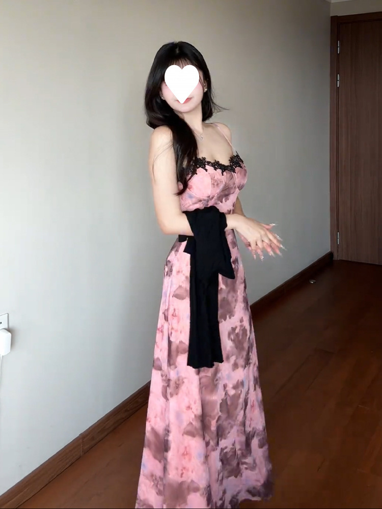 甘いクールな風のピンクの立体の蝶結びのサスペンダーの胸のワンピースの女性の春の夏のギャルは腰を収めてやせているスカートの潮を現します。