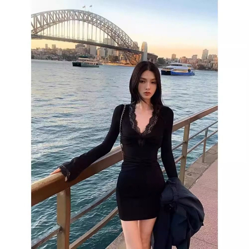 法式气质蕾丝拼接V领扭结长袖连衣裙女秋冬新款修身显瘦包臀短裙