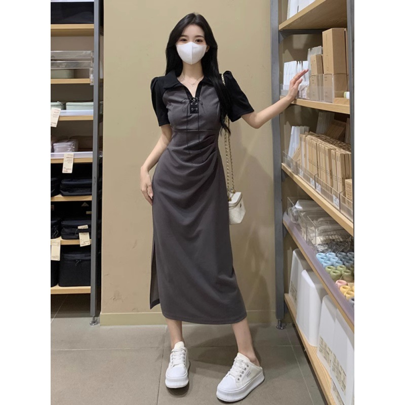デザイン感Polo襟半袖ワンピース女性夏の大きいサイズ太ったmmのしわが腰を収めて痩せている隠れ肉の長いスカート