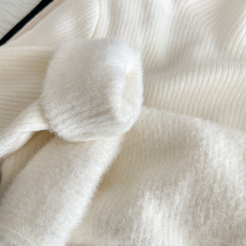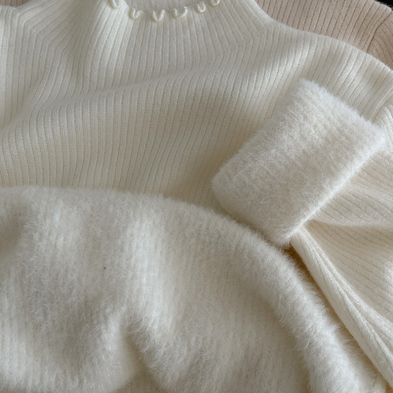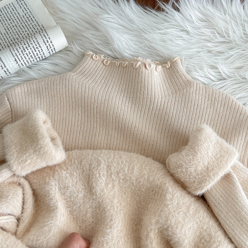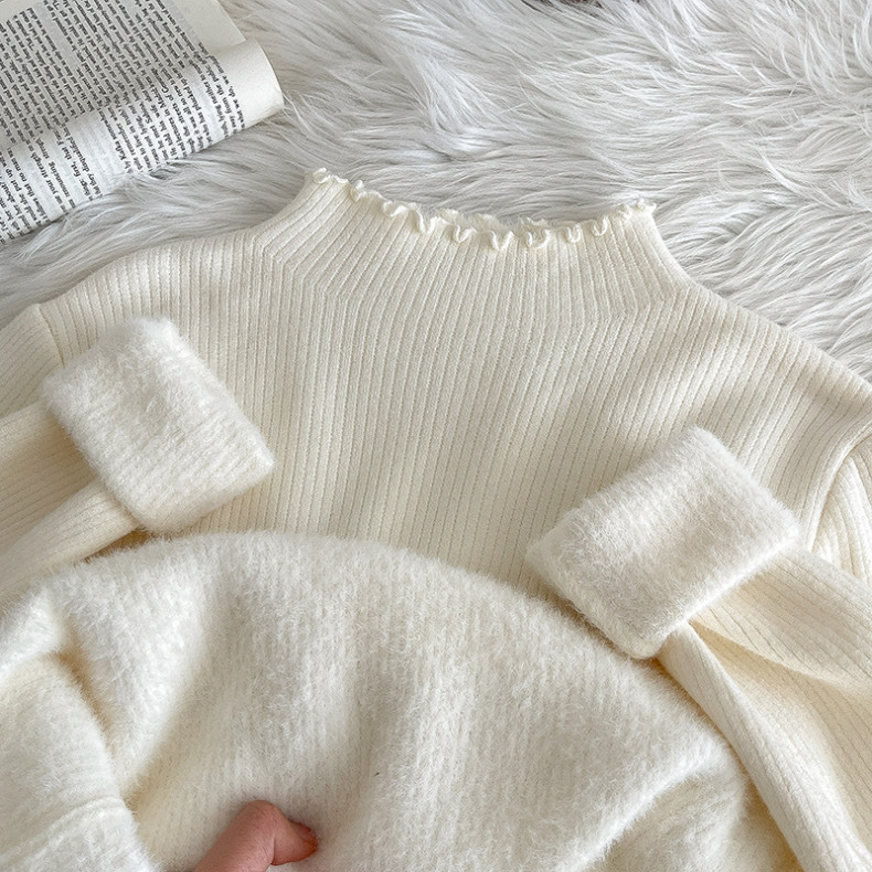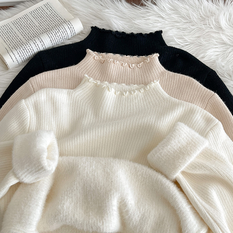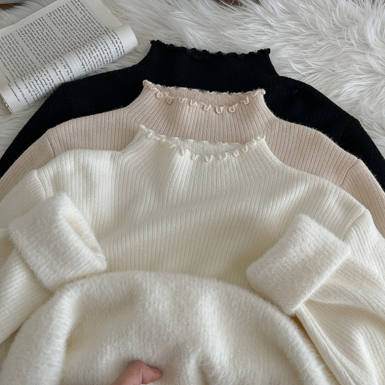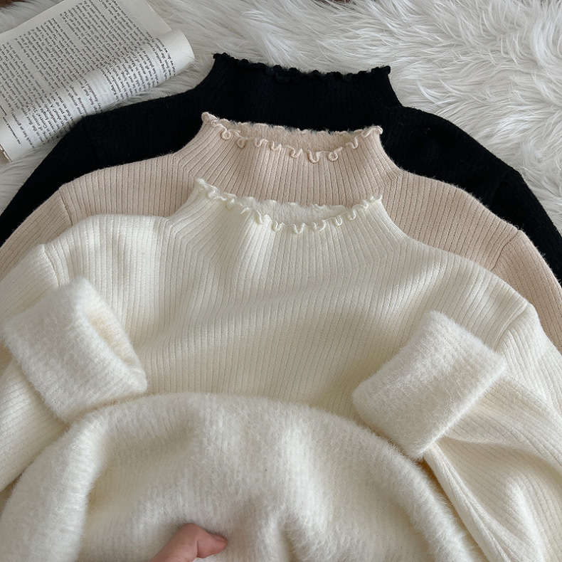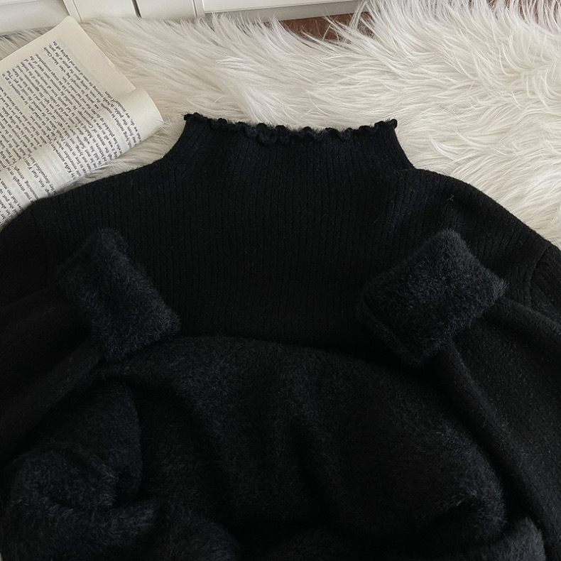 原版质量 加绒加厚一体绒针织打底衫女装木耳边半高领毛衣秋冬季