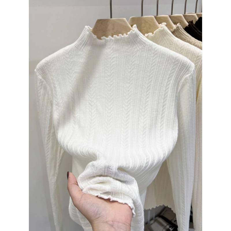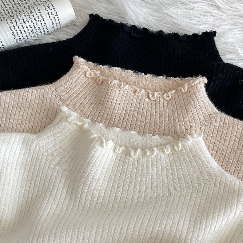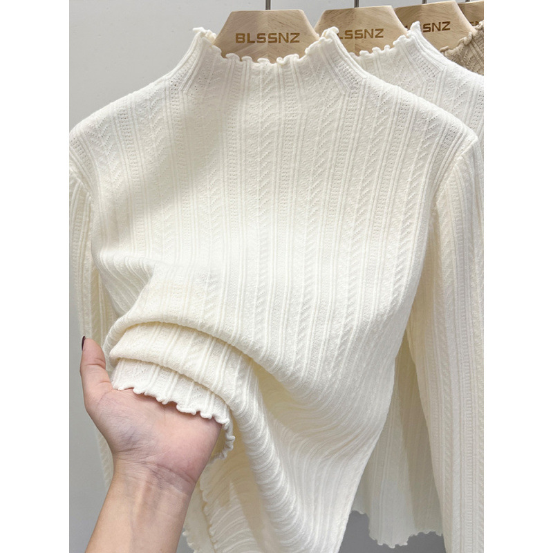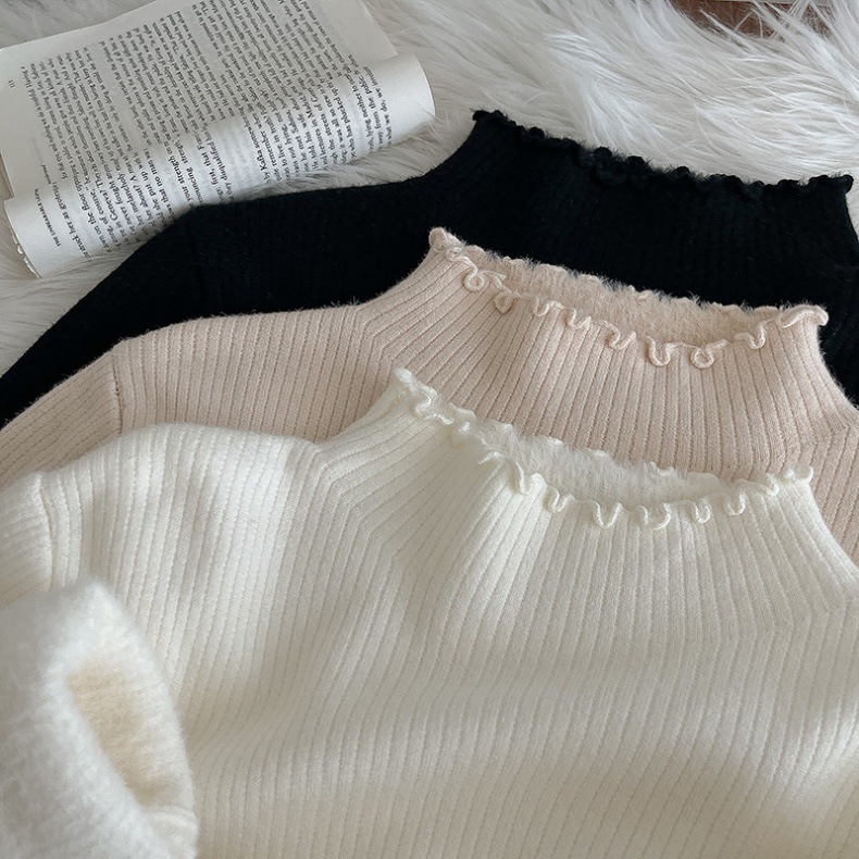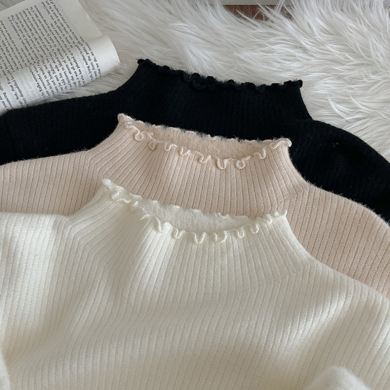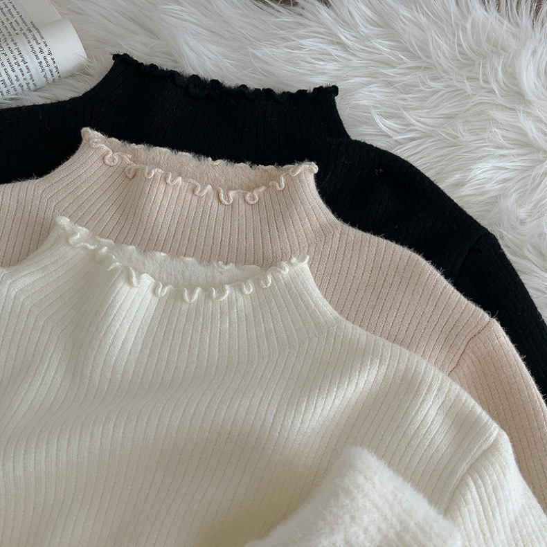 半高领木耳边打底针织衫女毛衣纯色春秋小众内搭别致修身上衣长袖