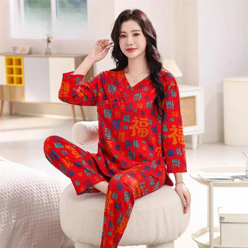 新款睡衣女盘扣百福字喜庆红色家居服套装新中式国风本命年外穿QL