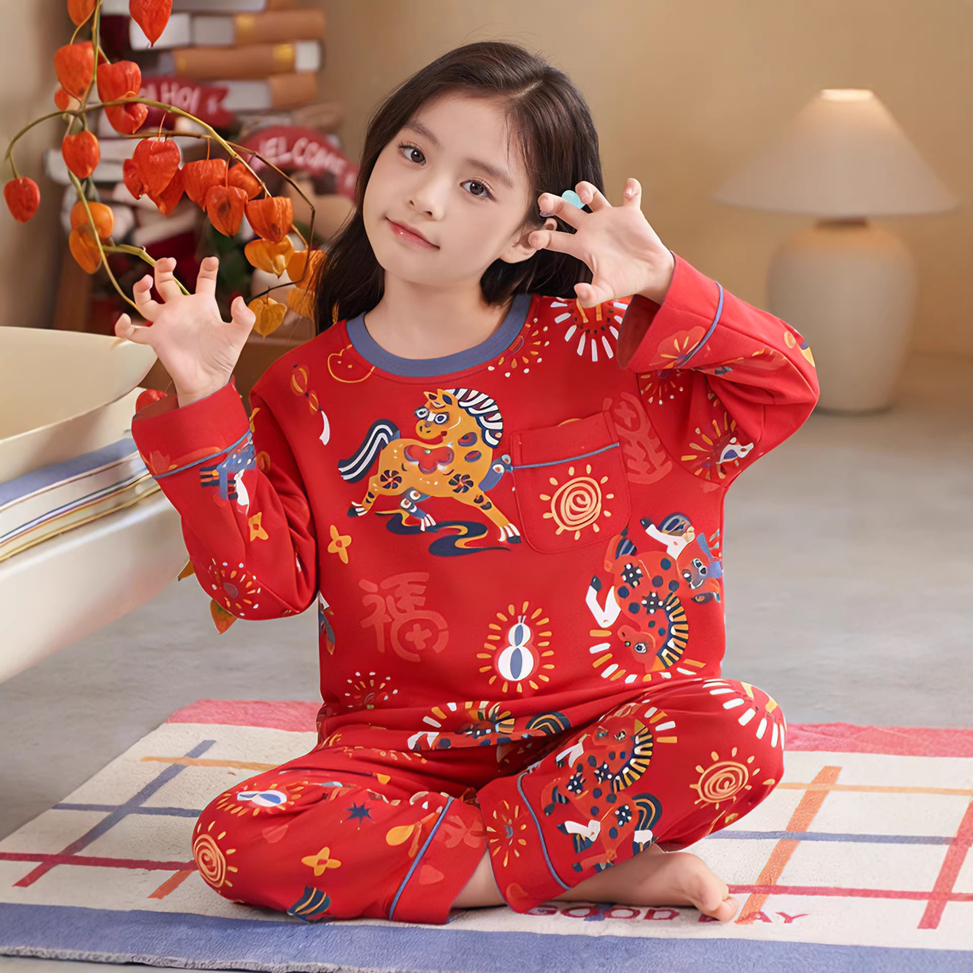 2026新年儿童睡衣女童纯棉马年红色套装本命年女孩大童家居服过年