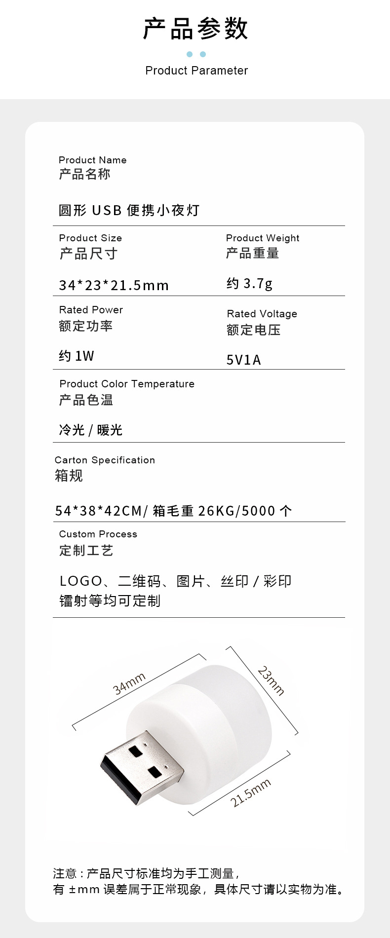 产品名称:USB小夜灯;即插即亮圆形小夜灯