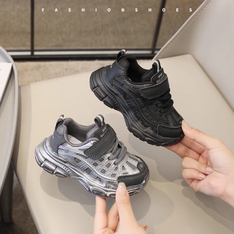 男の子のタイヤの靴の滑り止め2025春と秋の新型の女の子の運動靴のシングルの中で子供のお父さんの靴の二綿の靴のファッション