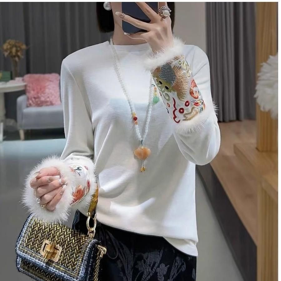 中国式の国風の婦人服の底のシャツの新型の袖口の刺繍は丸首のtシャツの上着の春の中で馬の甲を組み合わせます。