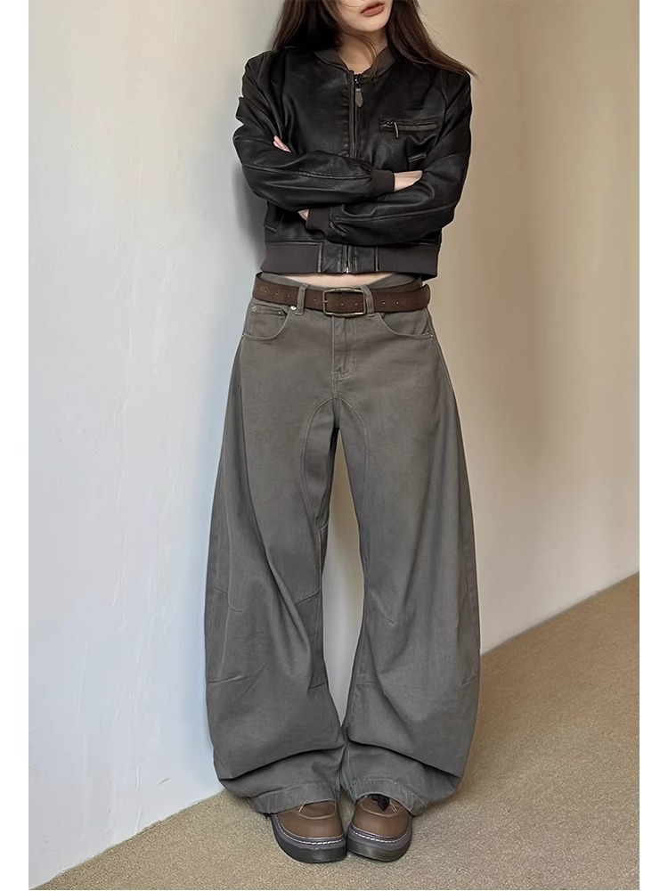 美拉徳郭形の広脚の曲がった刀のジーパンの春秋の新型の男女のアメリカの復古のしわの百合のゆったりしているズボン