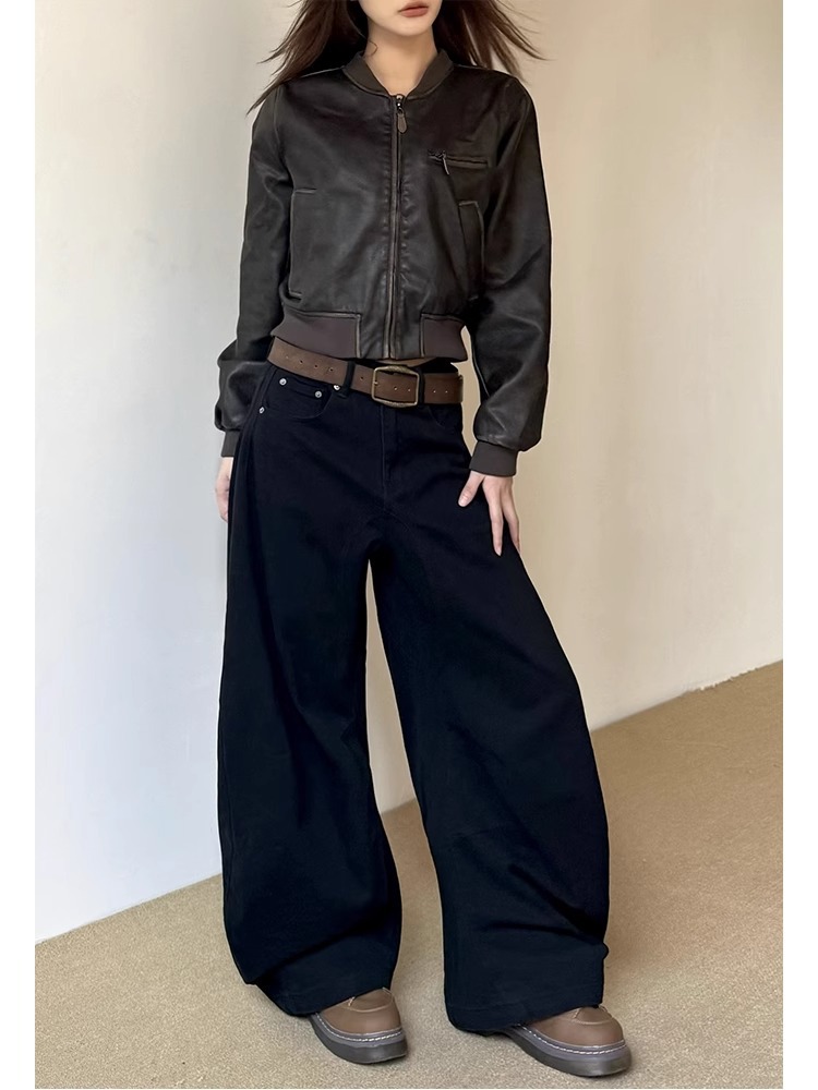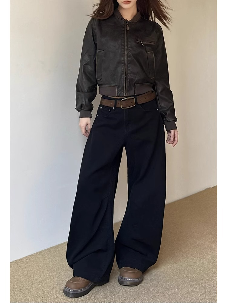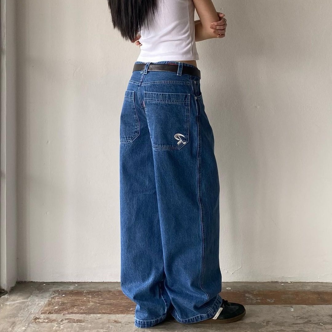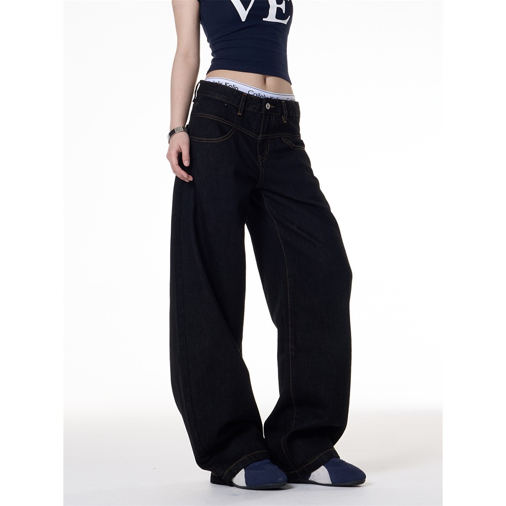 美式复古辣妹深蓝色阔腿弯刀牛仔裤男女新款宽松显瘦百搭直筒长裤