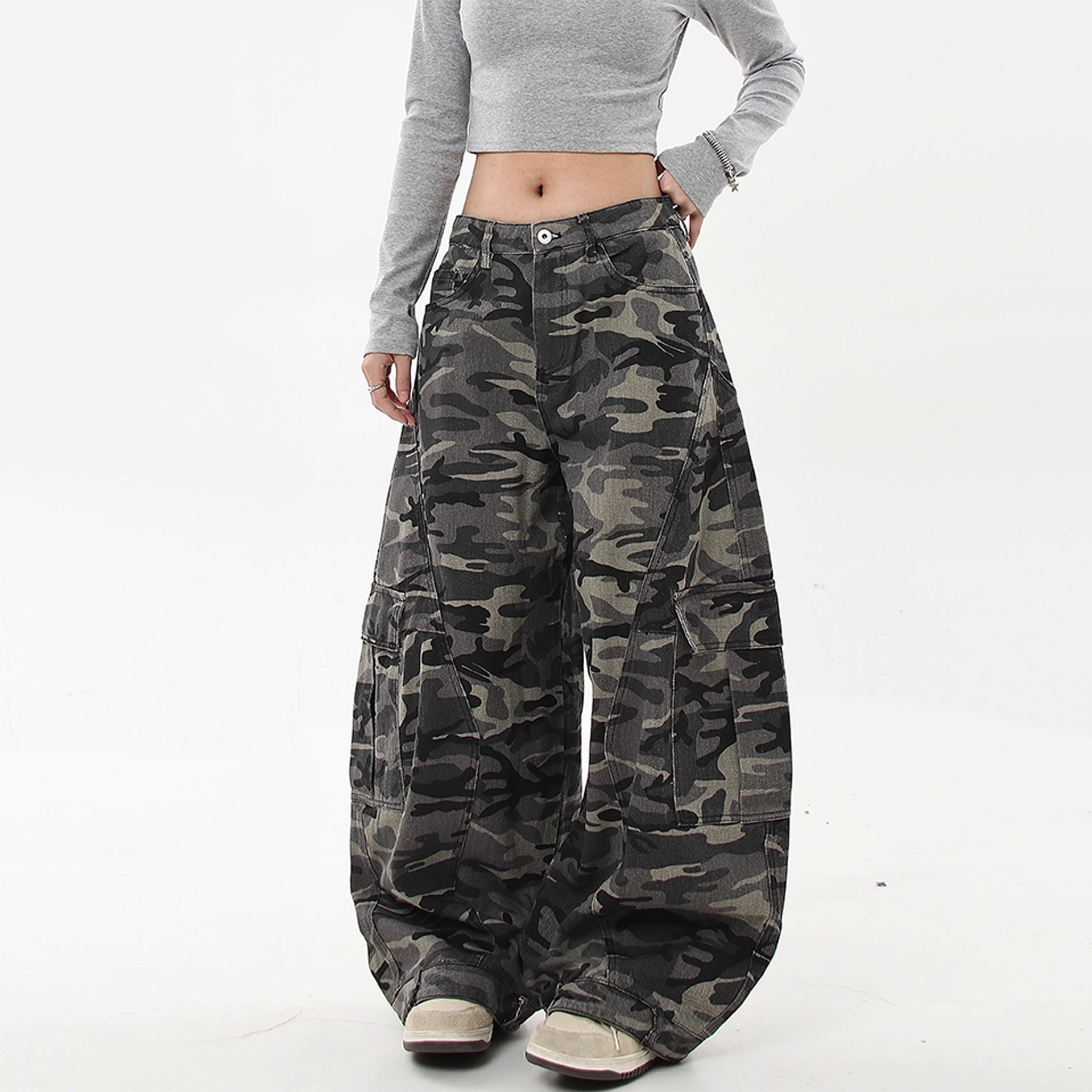 迷彩カーゴジーンズ女性の 2025 夏の新アメリカンレトロマルチポケットワイドレッグデコンストラクトバナナシミズパンツ