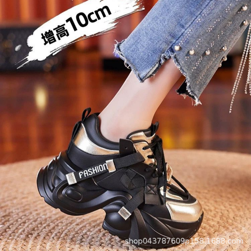 お父さんの靴の黒い金は色の女性にぶつかって2025年の春秋の新型の韓国版はやせている厚い底の8cmの軽やかな百合の運動靴を現します。