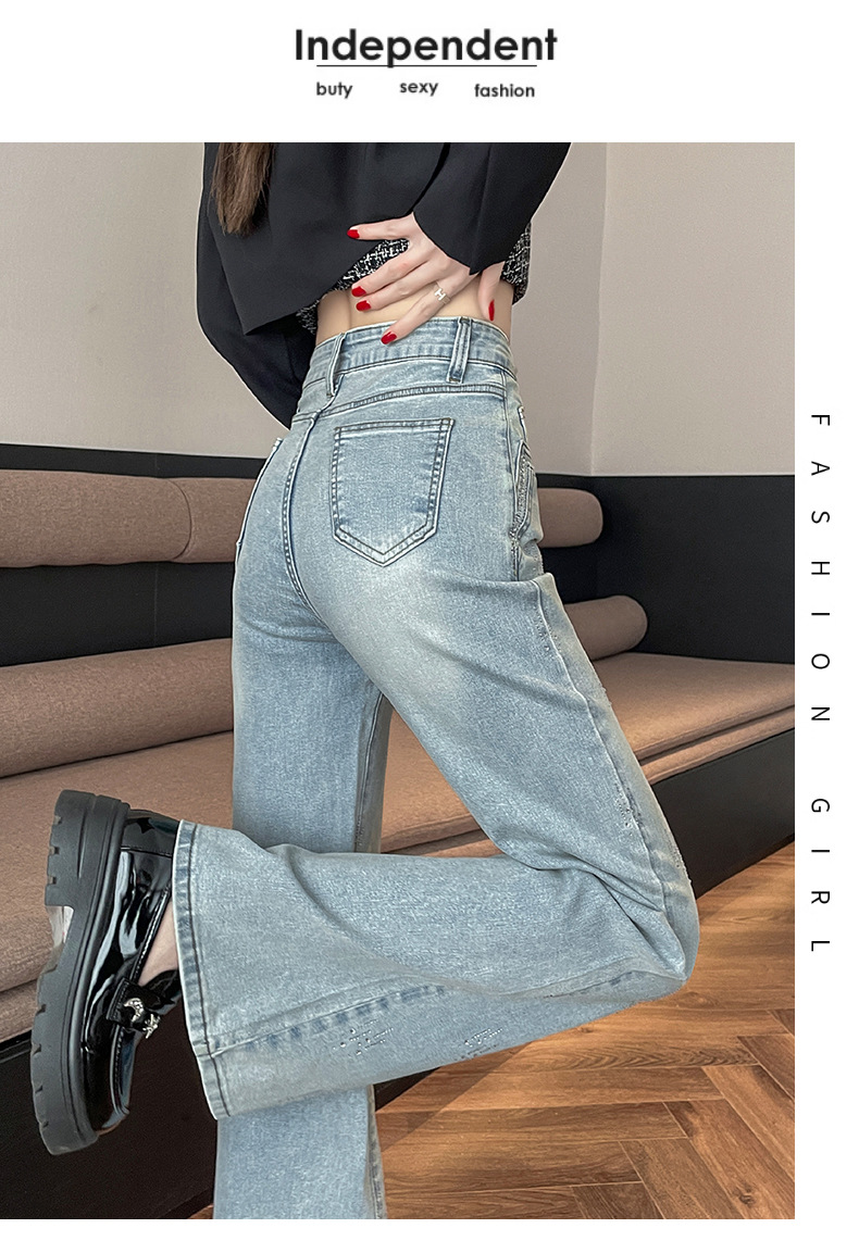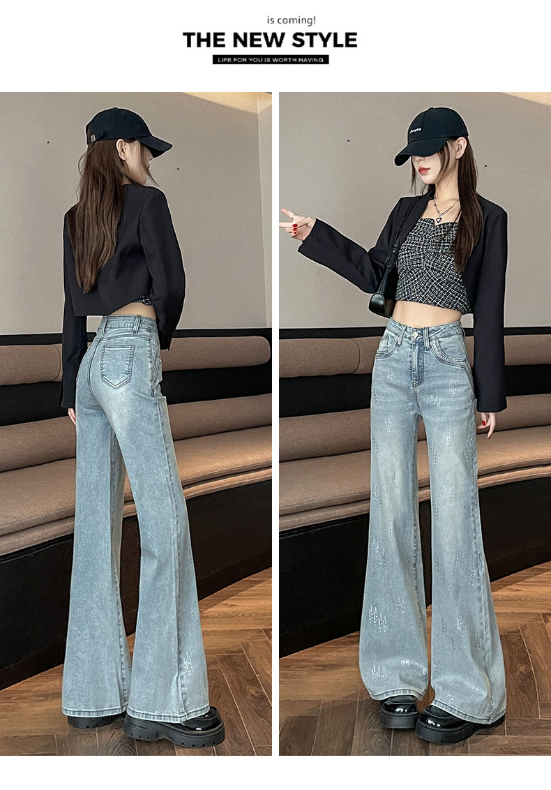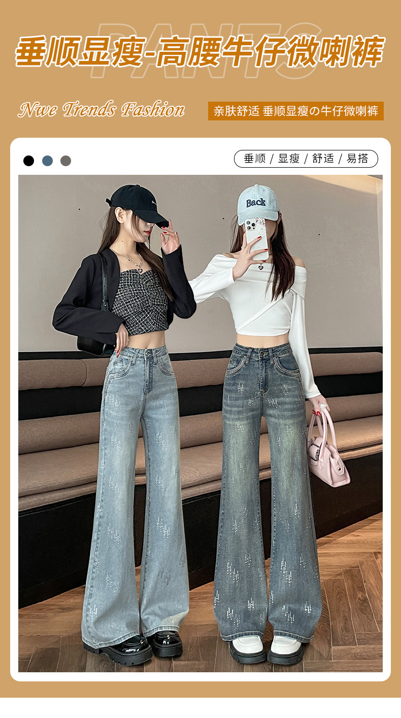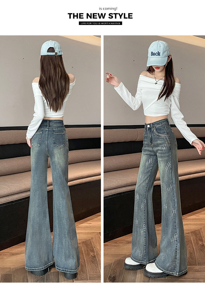 满天星辣妹牛仔微喇裤女秋冬季新款设计感高腰烫钻喇叭拖地裤子