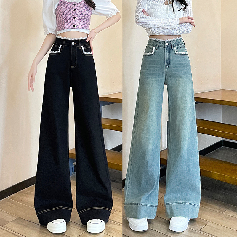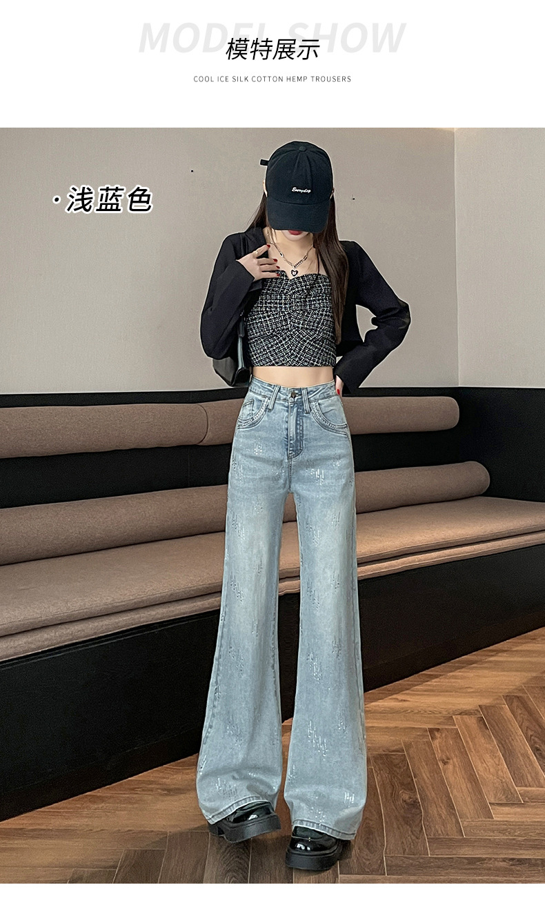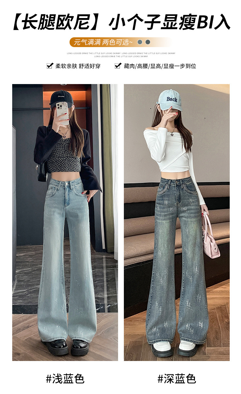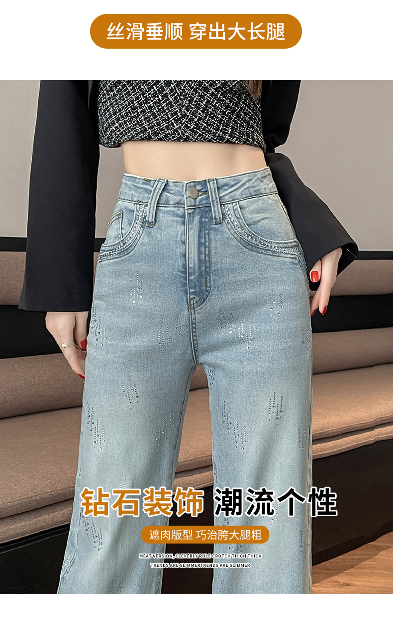 烫钻高腰阔腿牛仔裤女长裤秋冬季新款遮胯显瘦浅蓝色宽松垂感裤子