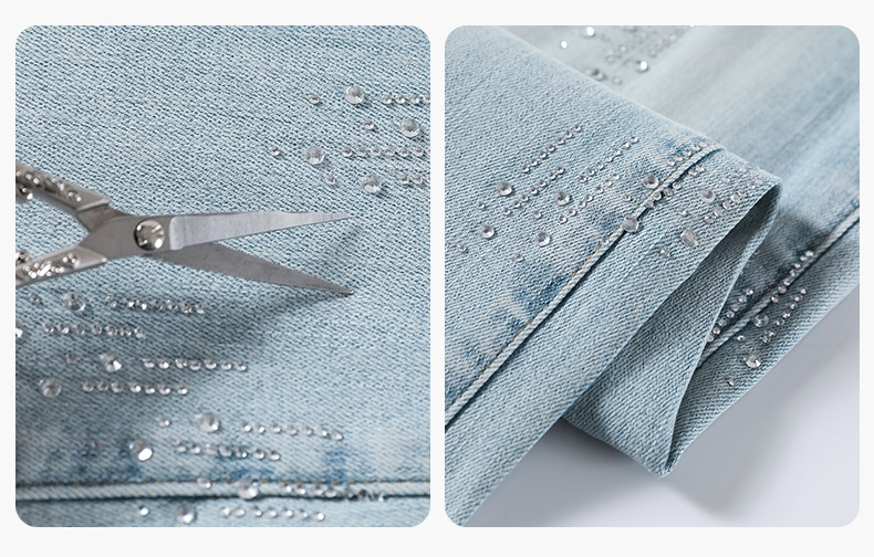 2025年春秋向け、高級感のあるラインストーン付き、小柄な女性向け、重工仕様の馬蹄型フレアデニムパンツ