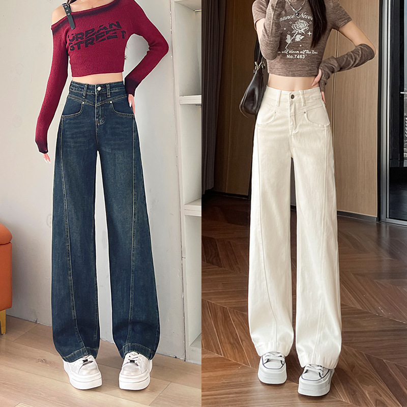 米の白い広脚のジーパンの女性の春と秋の長ズボンの新型のハイウエストはやせている設計感を現して曲がった刀のズボンをつなぎ合わせます。