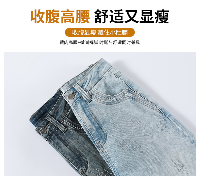 烫钻喇叭裤女长裤春秋装新款高腰显瘦修身弹力重工微喇牛仔裤子