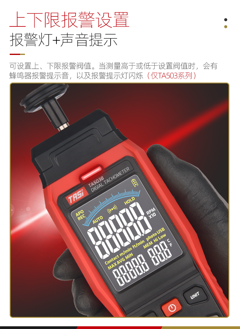 仕様 TA506A【非接触】ベーシックモデル,TA500A [非接触] (99999 rpm),TA501A [非接触] (ライトスクリーンアラーム+温度表示),TA500B[接触式](回転数/線速/線長),TA500C【兼用タイプ】(レーザー/接触速度/線速/線長),TA503A [非接触] (音と光のアラーム + データ記録 + 温度表示),TA503B [接触式] (音と光のアラーム + データ記録 + 温度表示),TA503C [兼用タイプ] (音・視覚アラーム+データ記録・アップロード+USBパソコン通信)