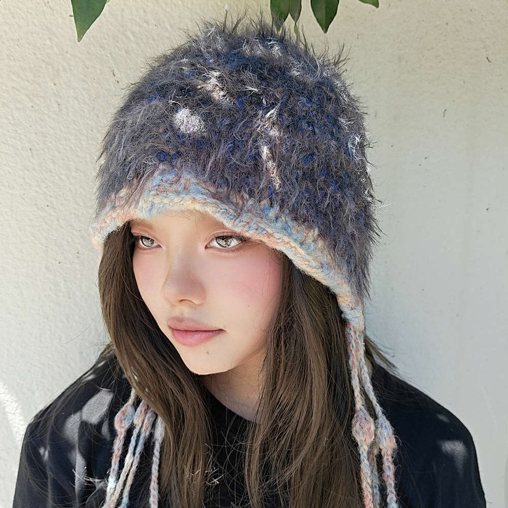 跨境彩色堆堆帽显脸小毛绒护耳帽流苏辫子包头帽多巴胺针织帽子