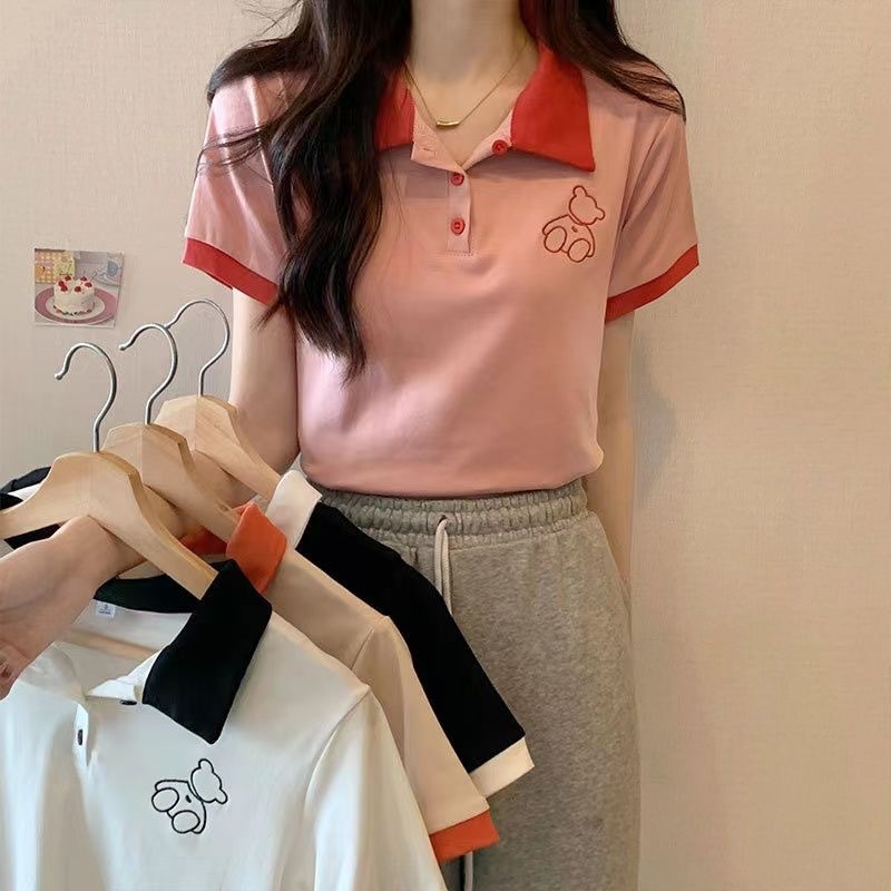 工場夏 2025 新しい韓国デザインコントラストカラーホワイトトップルーズベア半袖ニット女性