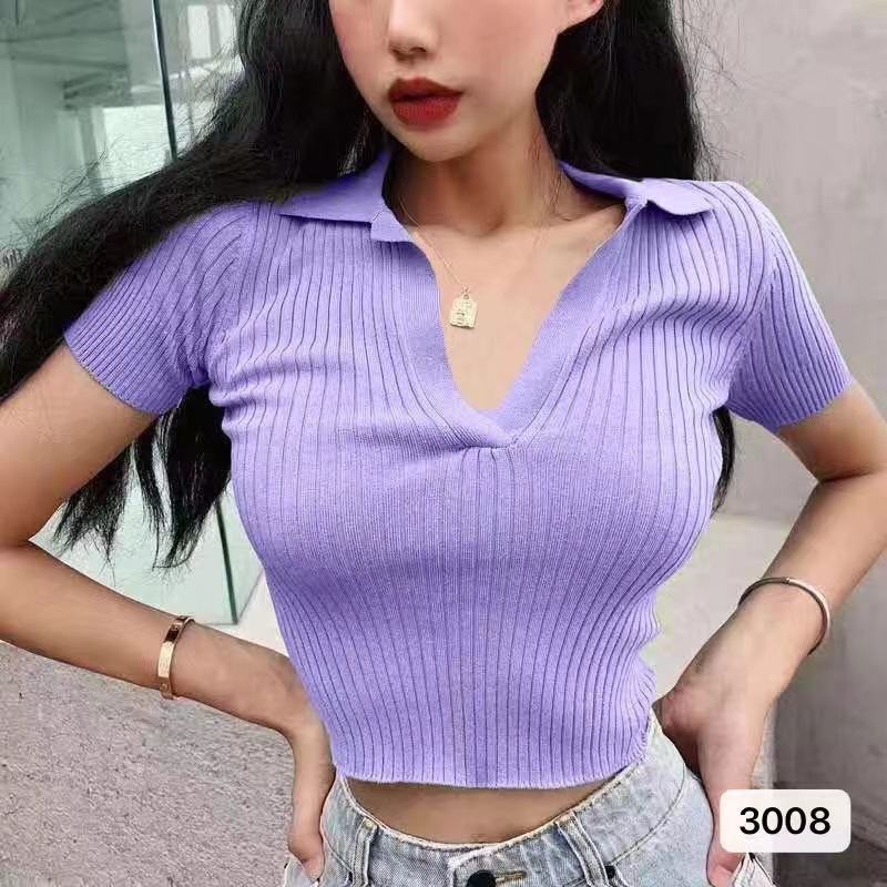 工場在庫あり ヒョナ風 レトロ ラペルニット 半袖シャツ レディース スリムフィット ショート丈 おしゃれ
