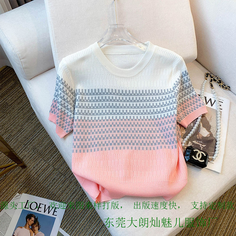 夏季新款针织衫复古条纹渐变设计小众短袖恤冰丝短款圆领上衣