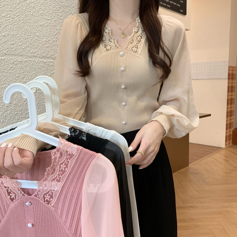 2025韓国版の新型襟は秋冬のシフォンの長袖のボタンの短いニットの気質の上着の女性の潮をつなぎ合わせます。