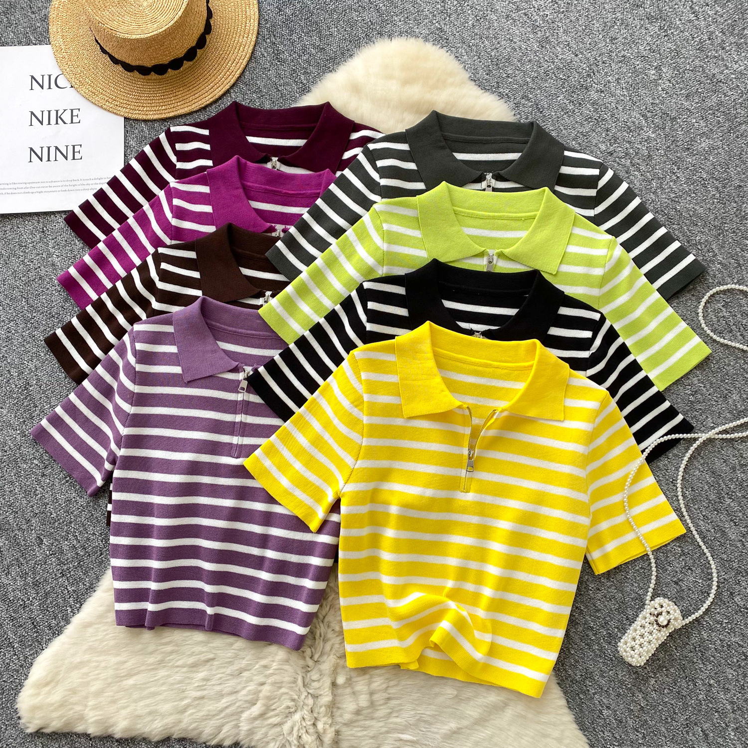 2026年新款设计感小众小个子短袖上衣条纹针织衫女领短款春季