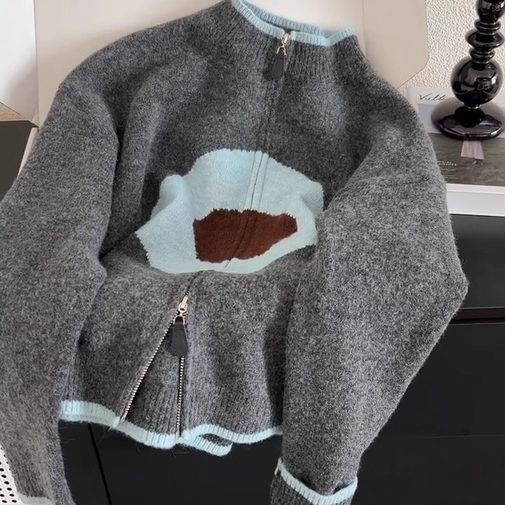 韩系撞色高级感拉链针织开衫秋冬慵懒休闲百搭学院风软糯毛衣外套