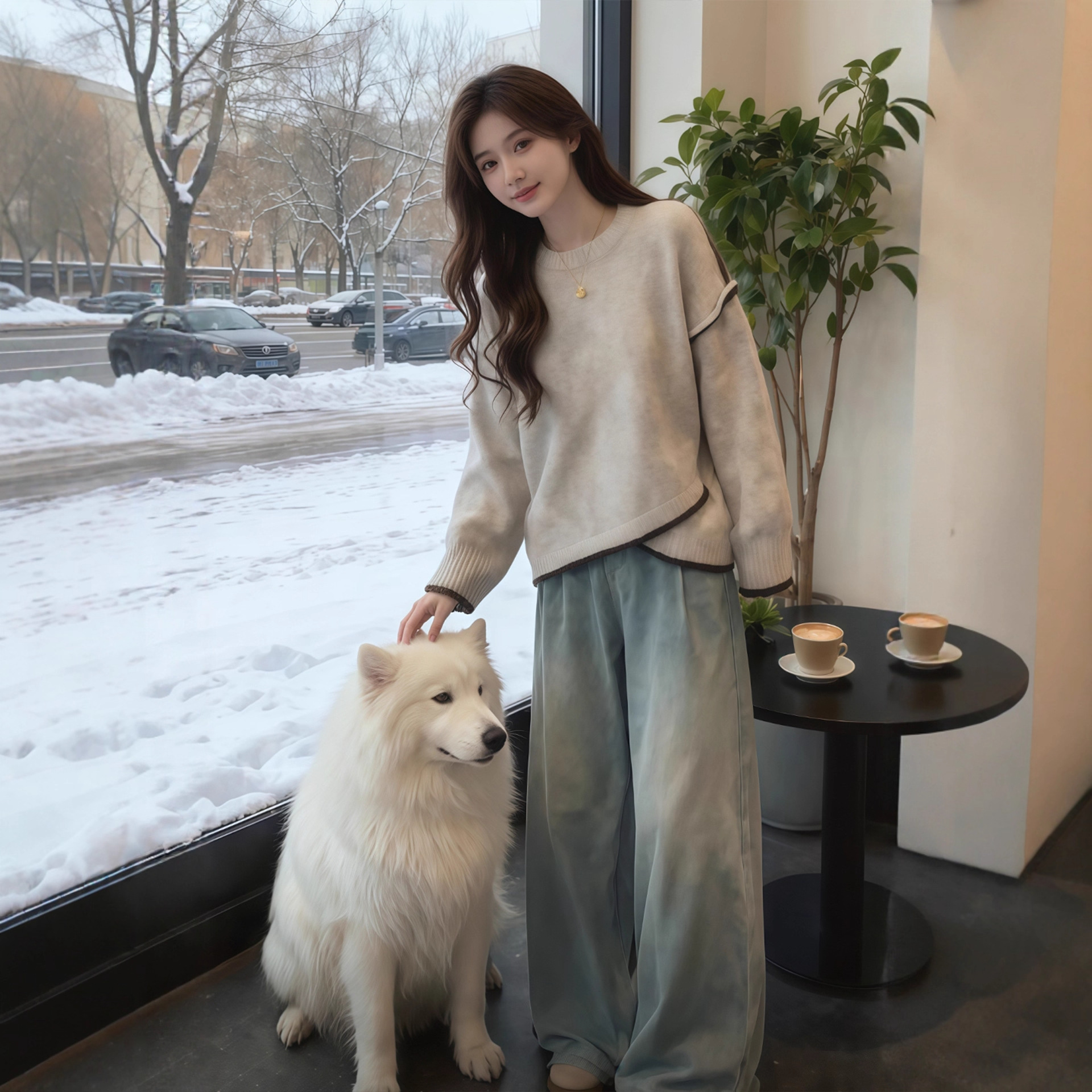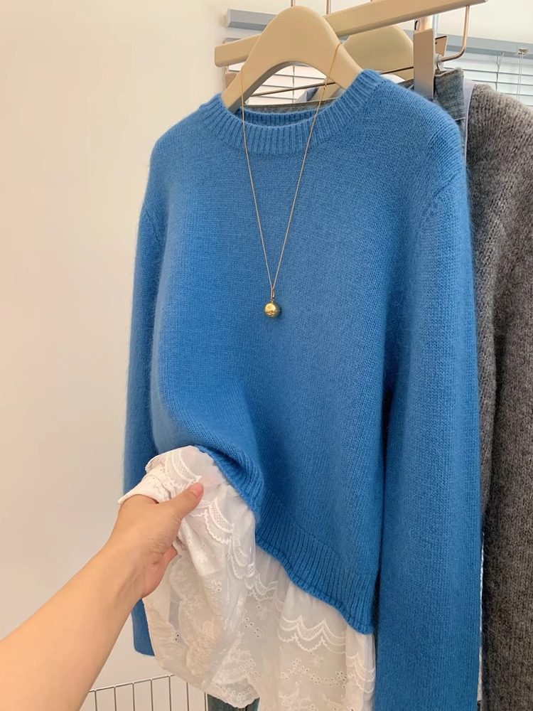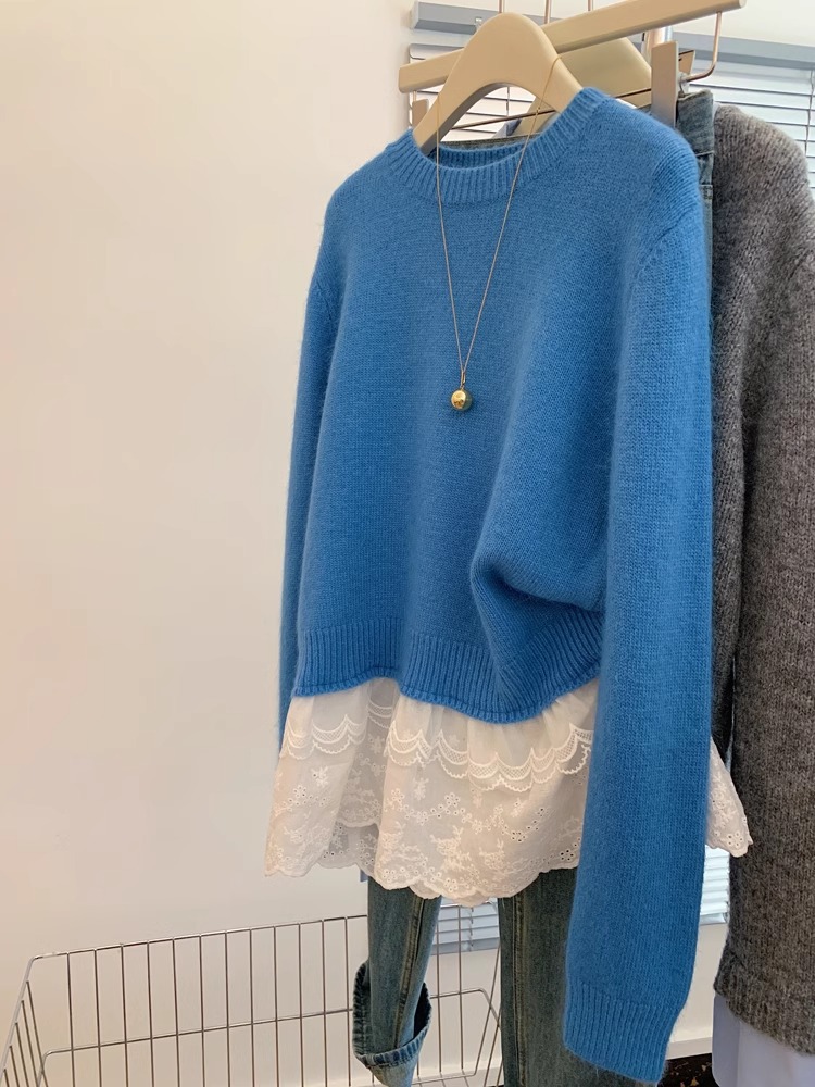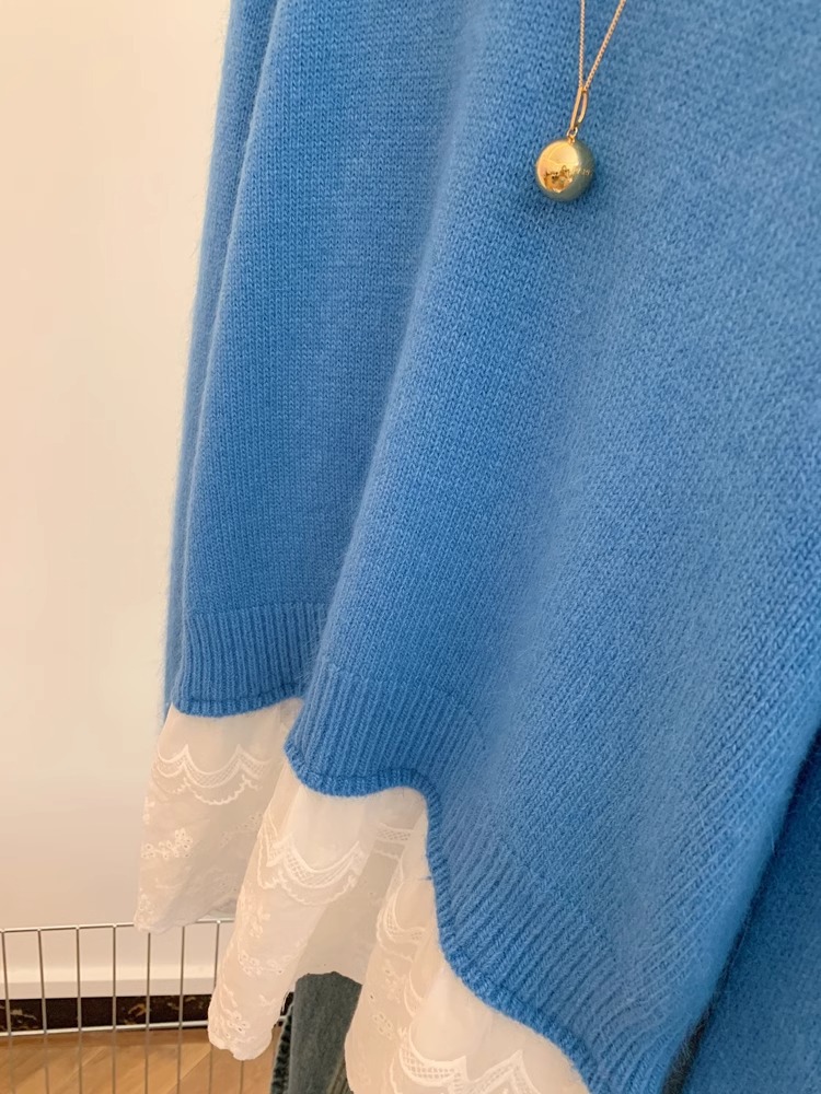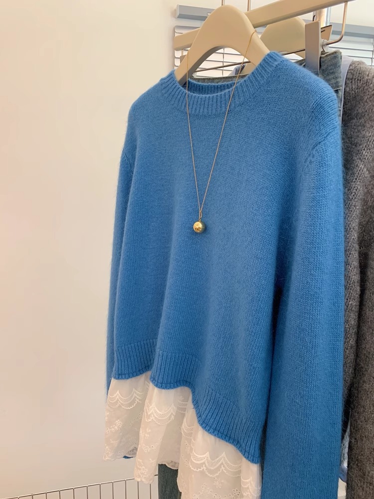 2025新型の青い偽の2つのレースのつなぎ合わせのゆったりした外はプルオーバーのセーターの女性の秋冬の怠惰な風の高級感を着ます。