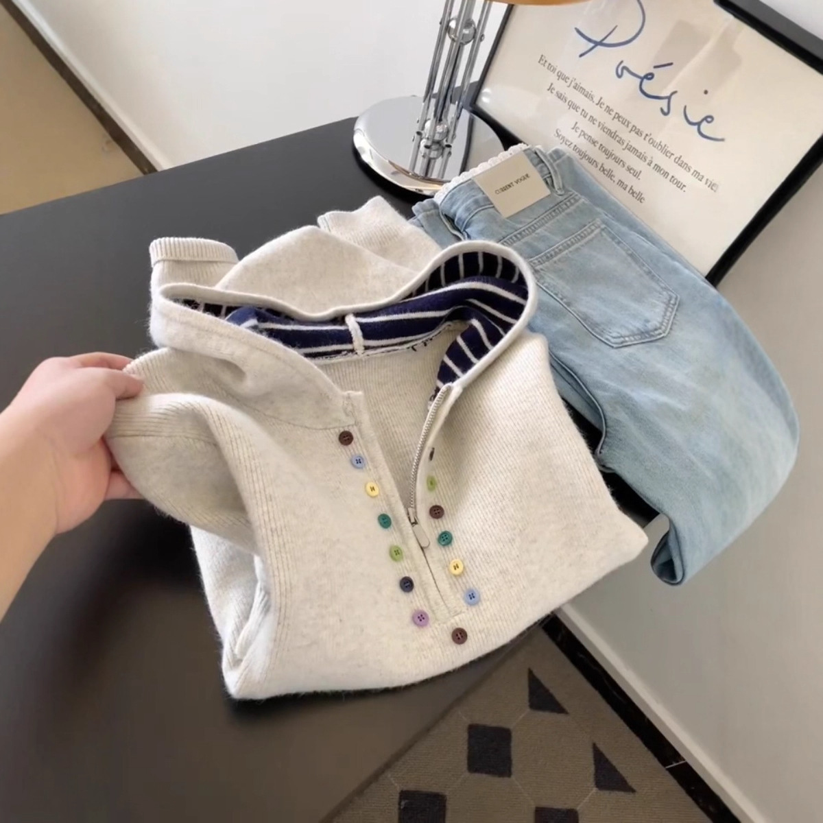 韩系慵懒风彩色纽扣半拉链连帽卫衣女秋冬新款设计感百搭针织毛衣