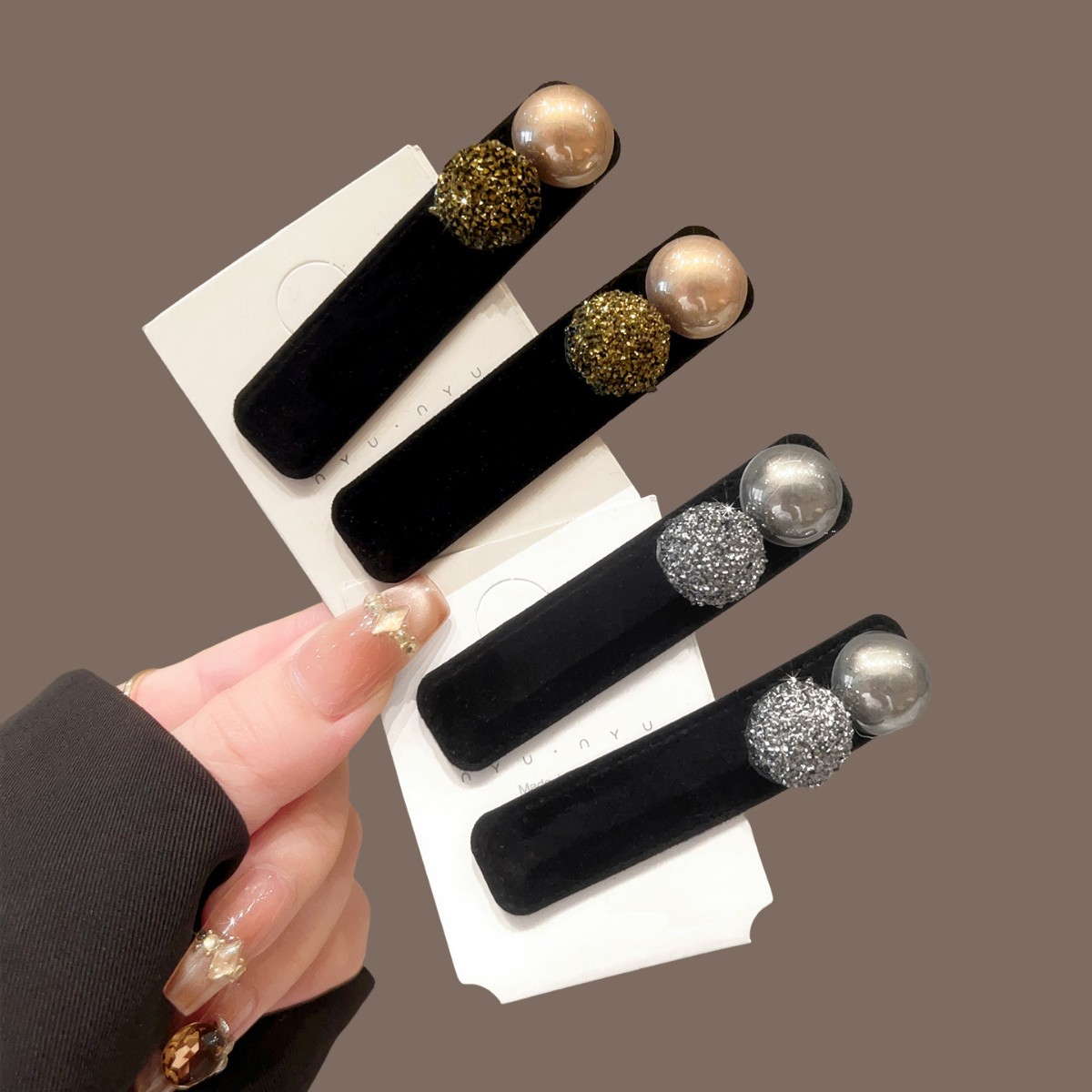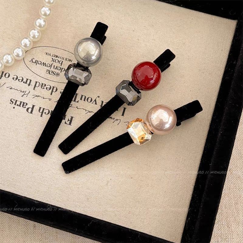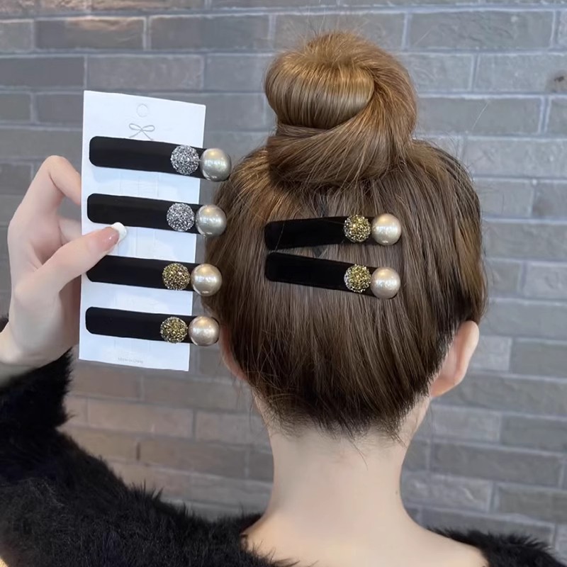 韩国新款精致丝绒珍珠一字夹高级水钻镶嵌发夹简约百搭鸭嘴夹侧边